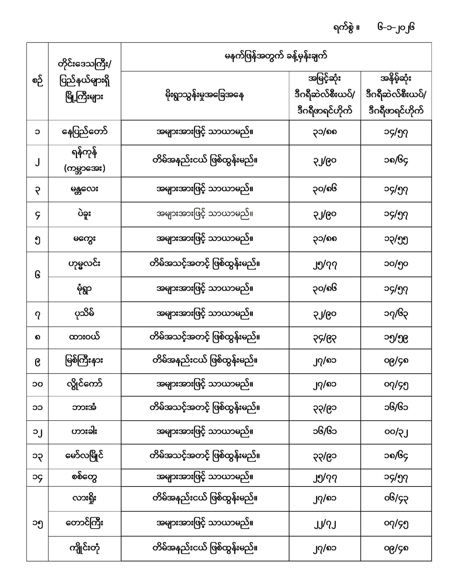 မနက်ဖြန်အတွက် တိုင်းဒေသကြီးနှင့် ပြည်နယ်များရှိ မြို့ကြီးများ၏ အမြင့်ဆုံးအပူချိန်၊ အနိမ့်ဆုံးအပူချိန်နှင့် မိုးလေဝသခန့်မှန်းချက်တို့ပဲဖြစ်ပါတယ်---