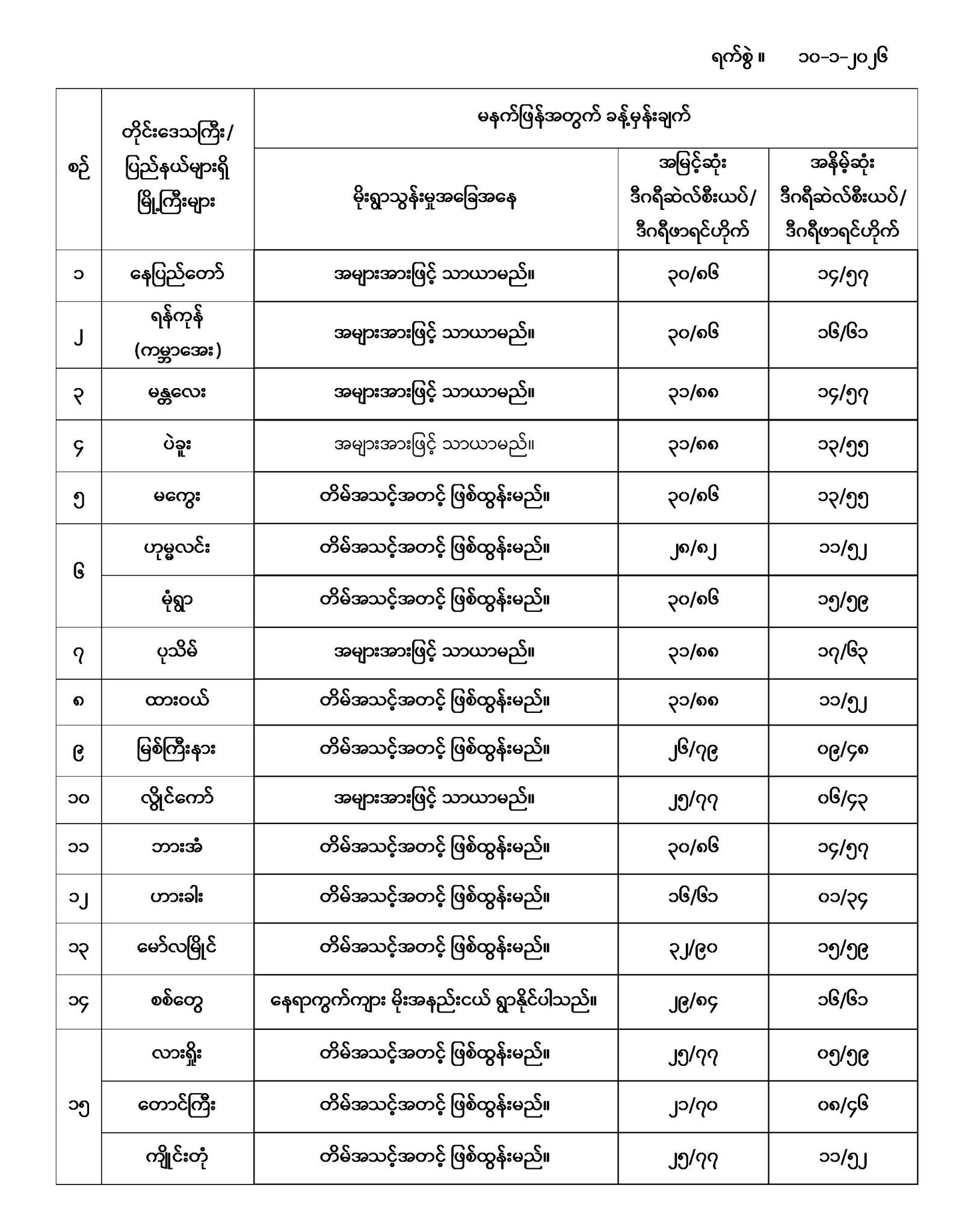 မနက်ဖြန်အတွက် တိုင်းဒေသကြီးနှင့် ပြည်နယ်များရှိ မြို့ကြီးများ၏ အမြင့်ဆုံးအပူချိန်၊ အနိမ့်ဆုံးအပူချိန်နှင့် မိုးလေဝသခန့်မှန်းချက်တို့ပဲဖြစ်ပါတယ်---