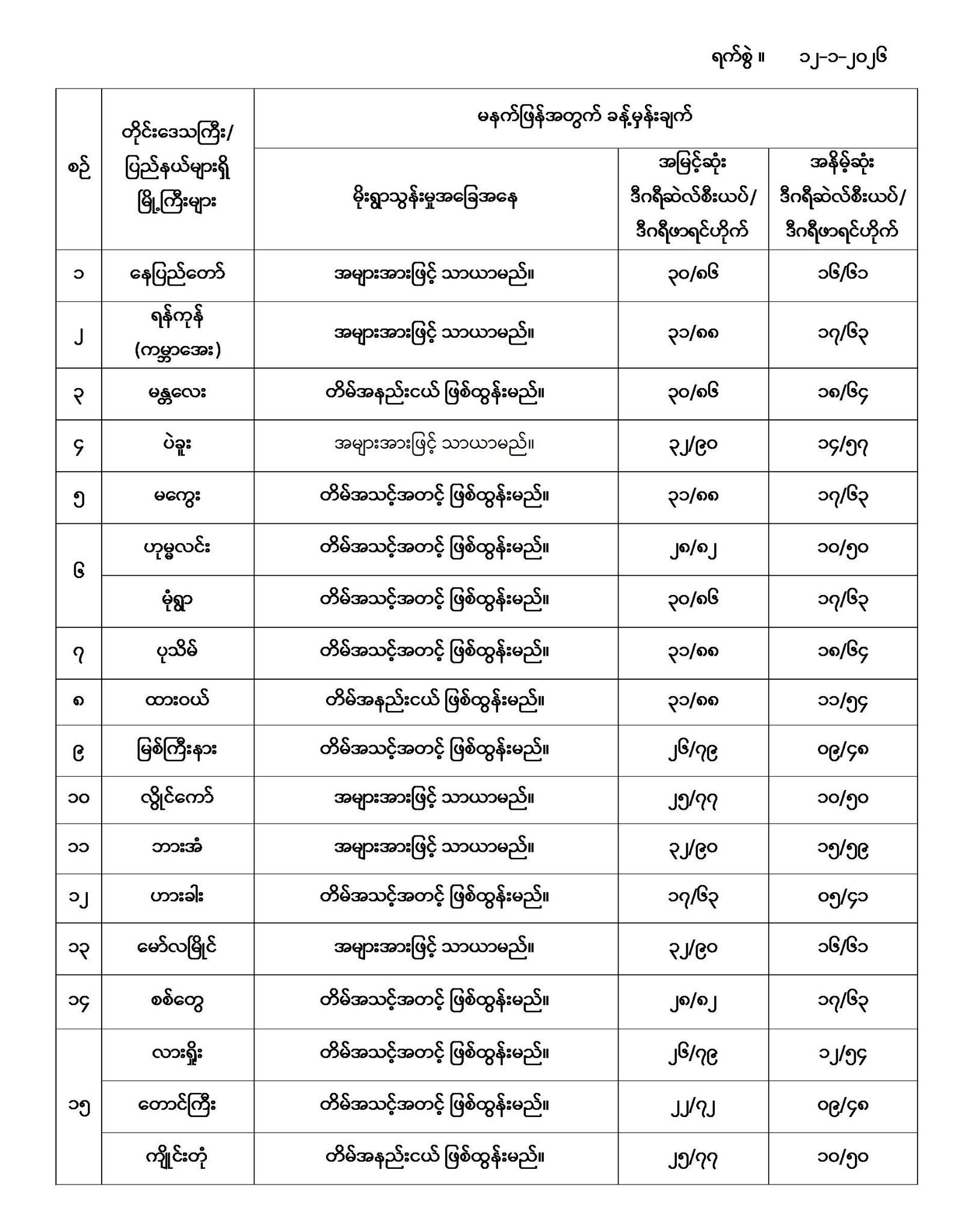 မနက်ဖြန်အတွက် တိုင်းဒေသကြီးနှင့် ပြည်နယ်များရှိ မြို့ကြီးများ၏ အမြင့်ဆုံးအပူချိန်၊ အနိမ့်ဆုံးအပူချိန်နှင့် မိုးလေဝသခန့်မှန်းချက်တို့ပဲဖြစ်ပါတယ်---