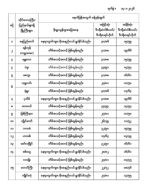 မနက်ဖြန်အတွက် တိုင်းဒေသကြီးနှင့် ပြည်နယ်များရှိ မြို့ကြီးများ၏ အမြင့်ဆုံးအပူချိန်၊ အနိမ့်ဆုံးအပူချိန်နှင့် မိုးလေဝသခန့်မှန်းချက်တို့ပဲဖြစ်ပါတယ်---