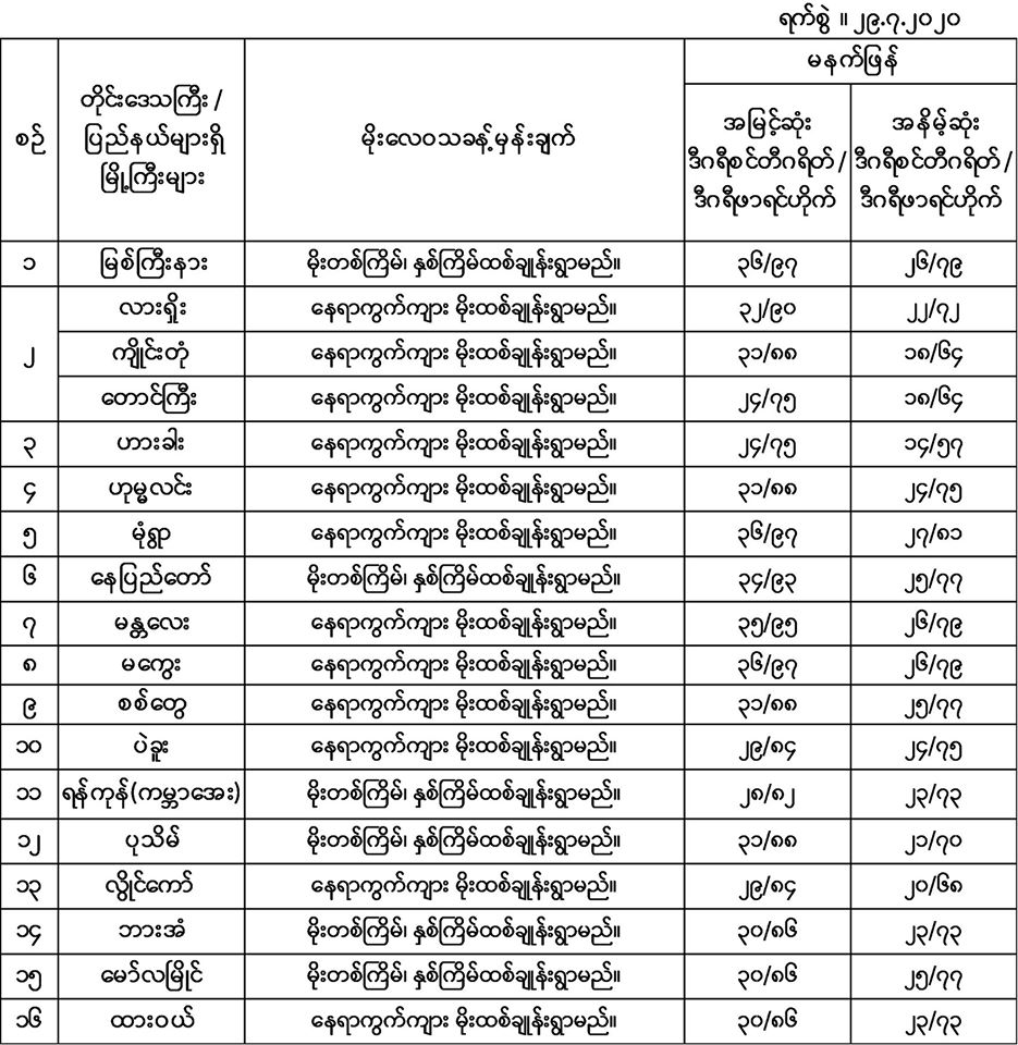 အောက်မှာဖော်ပြထားတာကတော့ မနက်ဖြန်အတွက် တိုင်းဒေသကြီးနှင့် ပြည်နယ်များရှိ မြို့ကြီးများ၏ အမြင့်ဆုံးအပူချိန်၊ အနိမ့်ဆုံးအပူချိန်နှင့် မိုးလေဝသခန့်မှန်းချက်တို့ပဲဖြစ်ပါတယ်။