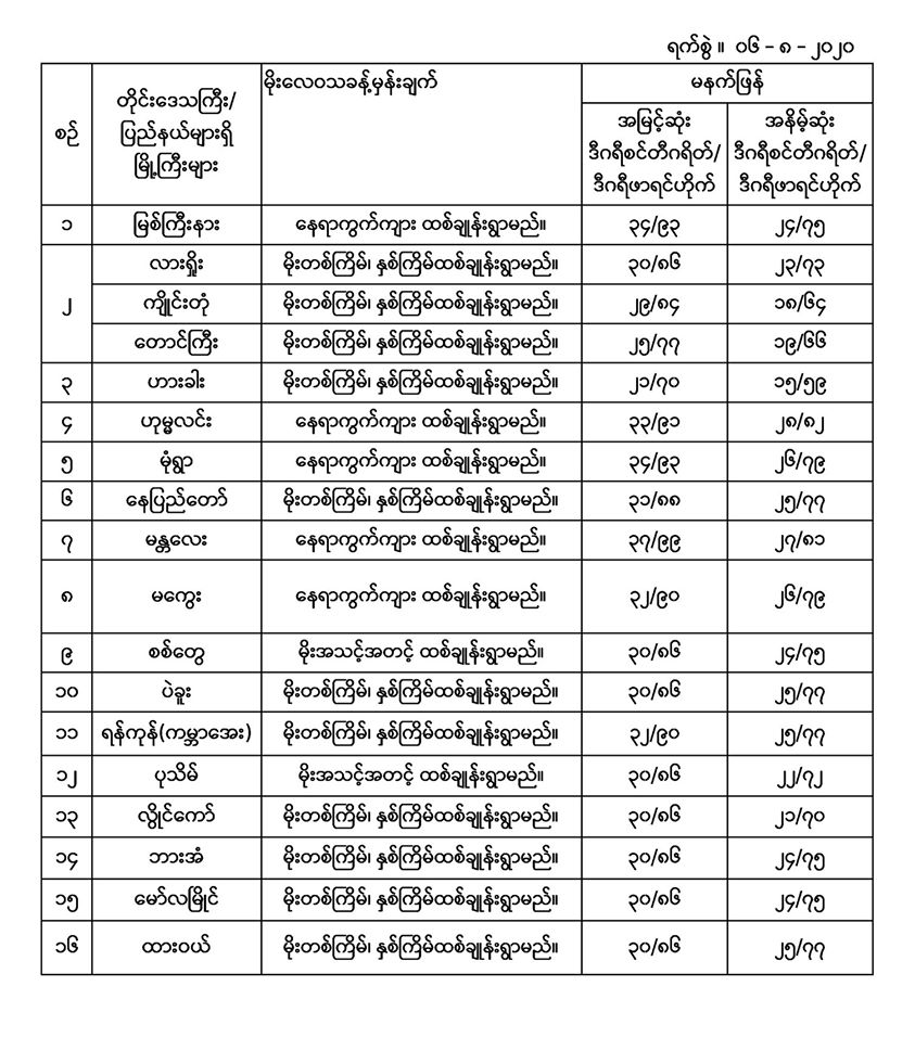 အောက်မှာဖော်ပြထားတာကတော့ မနက်ဖြန်အတွက် တိုင်းဒေသကြီးနှင့် ပြည်နယ်များရှိ မြို့ကြီးများ၏ အမြင့်ဆုံးအပူချိန်၊ အနိမ့်ဆုံးအပူချိန်နှင့် မိုးလေဝသခန့်မှန်းချက်တို့ပဲဖြစ်ပါတယ်။