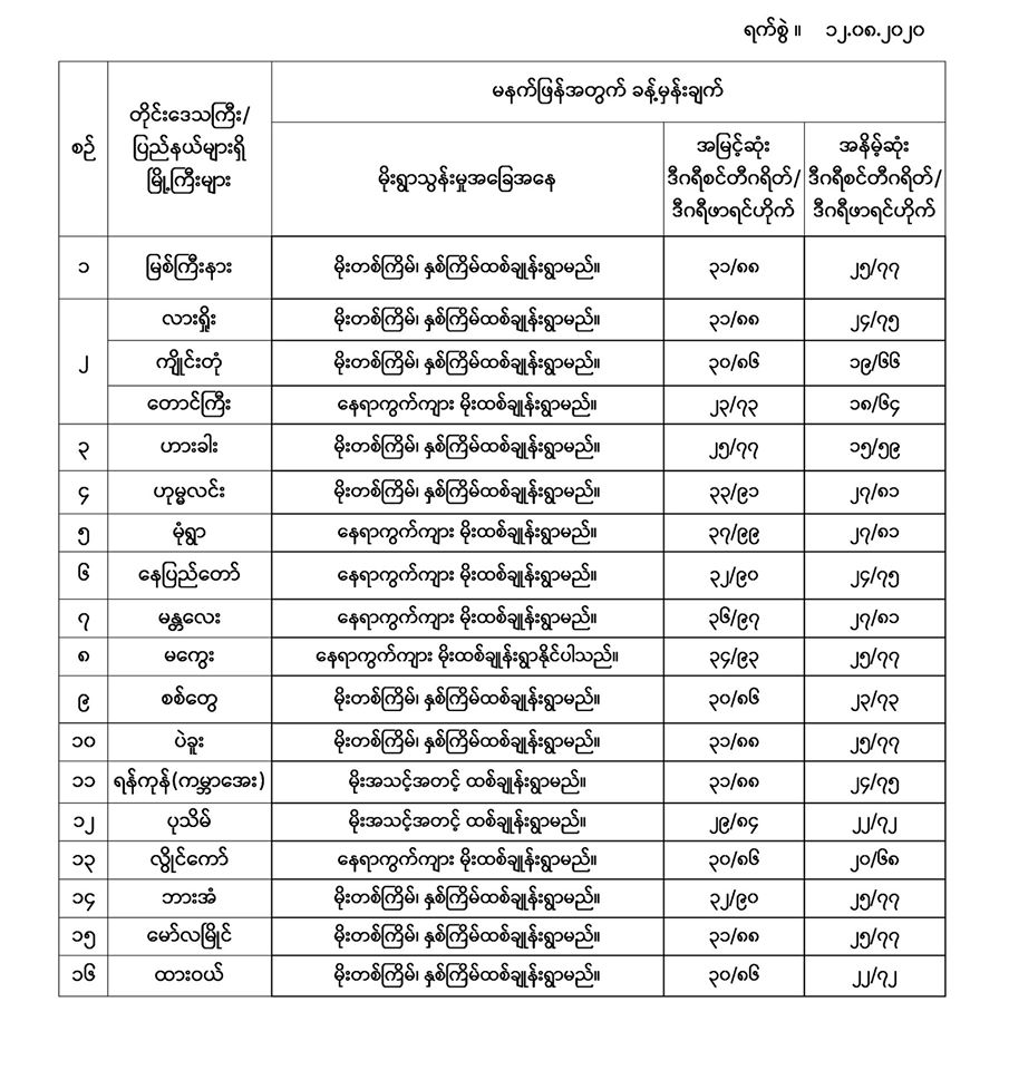 အောက်မှာဖော်ပြထားတာကတော့ မနက်ဖြန်အတွက် တိုင်းဒေသကြီးနှင့် ပြည်နယ်များရှိ မြို့ကြီးများ၏ အမြင့်ဆုံးအပူချိန်၊ အနိမ့်ဆုံးအပူချိန်နှင့် မိုးလေဝသခန့်မှန်းချက်တို့ပဲဖြစ်ပါတယ်။