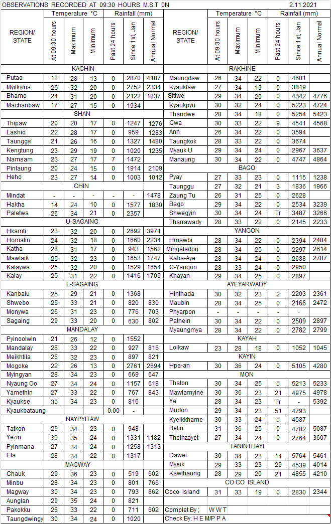 အောက်မှာဖော်ပြထားတာကတော့ ယမန်နေ့ညနေက တိုင်းထွာရရှိခဲ့သော တိုင်းဒေသကြီးနှင့် ပြည်နယ်များ၏ အမြင့်ဆုံးအပူချိန်၊ ယနေ့တိုင်းထွာရရှိခဲ့သော အနိမ့်ဆုံးအပူချိန်နှင့် မိုးရေချိန်တို့ပဲ ဖြစ်ပါတယ်---