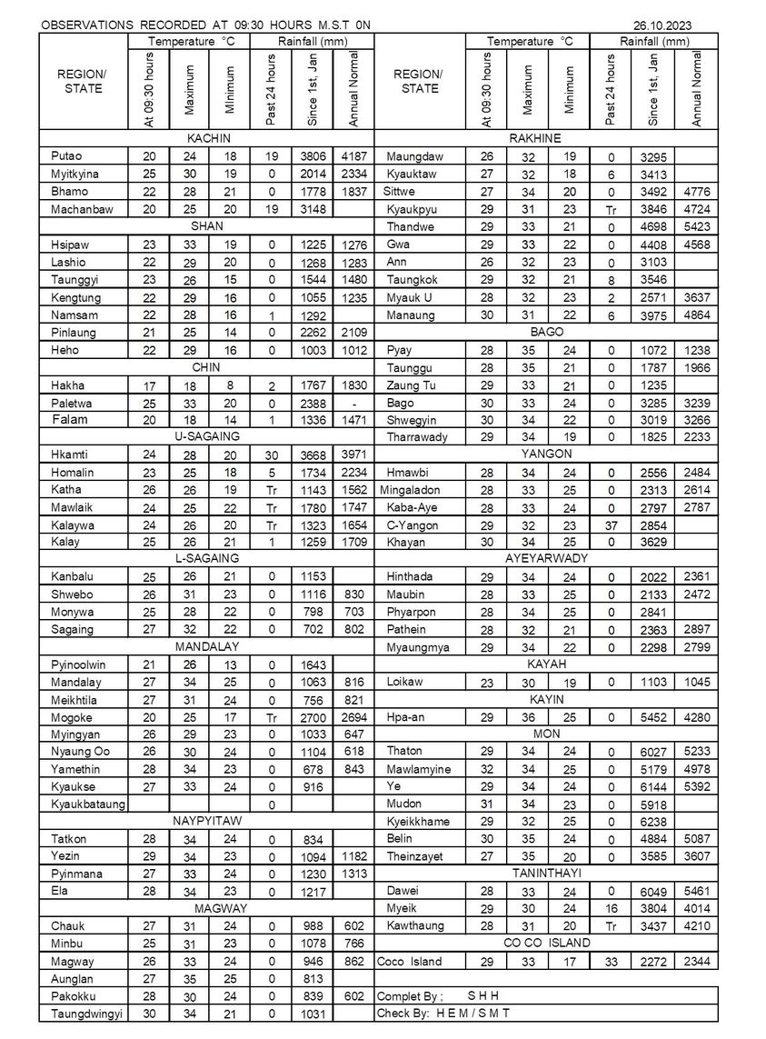 အောက်မှာဖော်ပြထားတာကတော့ ယမန်နေ့ညနေက တိုင်းထွာရရှိခဲ့သော တိုင်းဒေသကြီးနှင့် ပြည်နယ်များ၏ အမြင့်ဆုံးအပူချိန်၊ ယနေ့တိုင်းထွာရရှိခဲ့သော အနိမ့်ဆုံးအပူချိန်နှင့် မိုးရေချိန်တို့ပဲ ဖြစ်ပါတယ်---