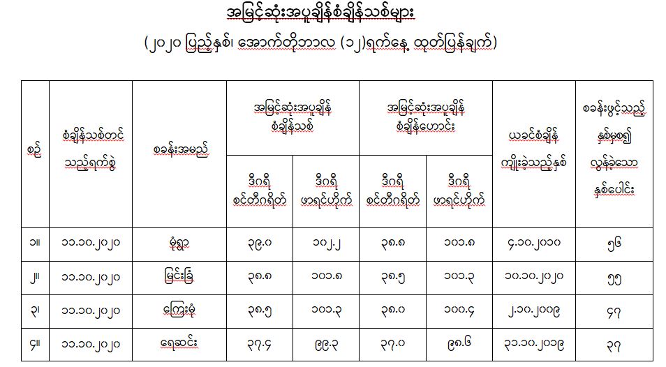 Oct 12,2020 |02:47 | (၂၀၂၀ ပြည့်နှစ်၊ အောက်တိုဘာလ (၁၂)ရက်နေ့ ထုတ်ပြန်ချက်) Crd. မိုးလေဝသနှင့်ဇလဗေဒညွှန်ကြားမှုဦးစီးဌာန