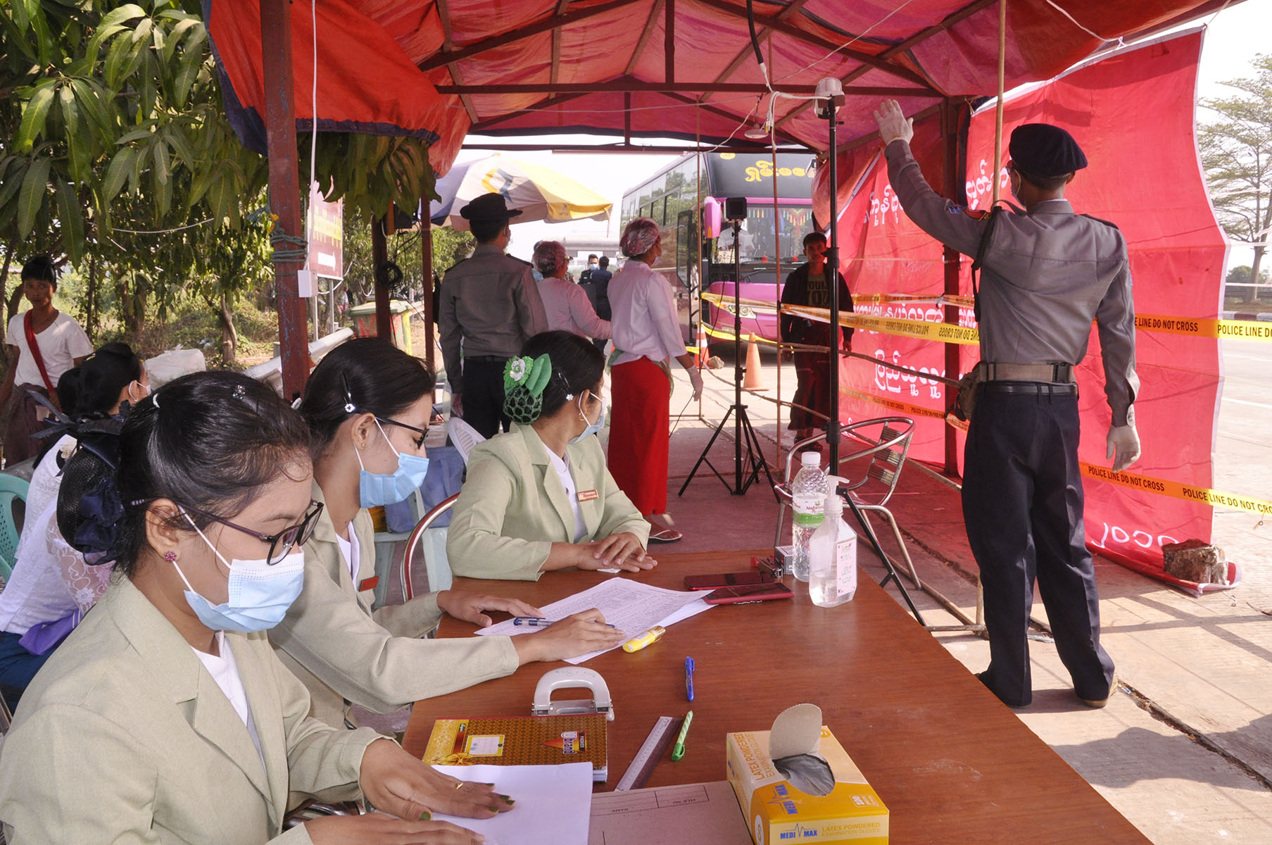 ရန်ကုန်မြို့ နေပြည်တော်အမြန်လမ်းမကြီးရှိ “ဝ” မိုင် Toll gate တွင် ရန်ကုန်မြို့အဝင် ခရီးသွားများအား ကျန်းမာရေးဦးစီး ဌာန၊အထွေထွေအုပ်ချုပ်ရေး၊ဌာနဆိုင်ရာများ၊ မြန်မာနိုင်ငံရဲတပ်ဖွဲ့နှင့် လူမှုရေးအသင်းအဖွဲ့တို့ ပူးပေါင်း၍ တိုင်းဒေသကြီးအတွင်း ကိုရိုနာဗိုင်းရပ်စ်ရောဂါကာကွယ်ထိန်းချုပ်ရေးလုပ်ငန်းတွင် Human body temperature system စက်ဖြင့် ရောဂါကာကွယ်ထိန်းချုပ်ရေးကို ဖိဖိစီးစီးဆောင်ရွက်လျှက်ရှိကြောင်း သိရသည်။