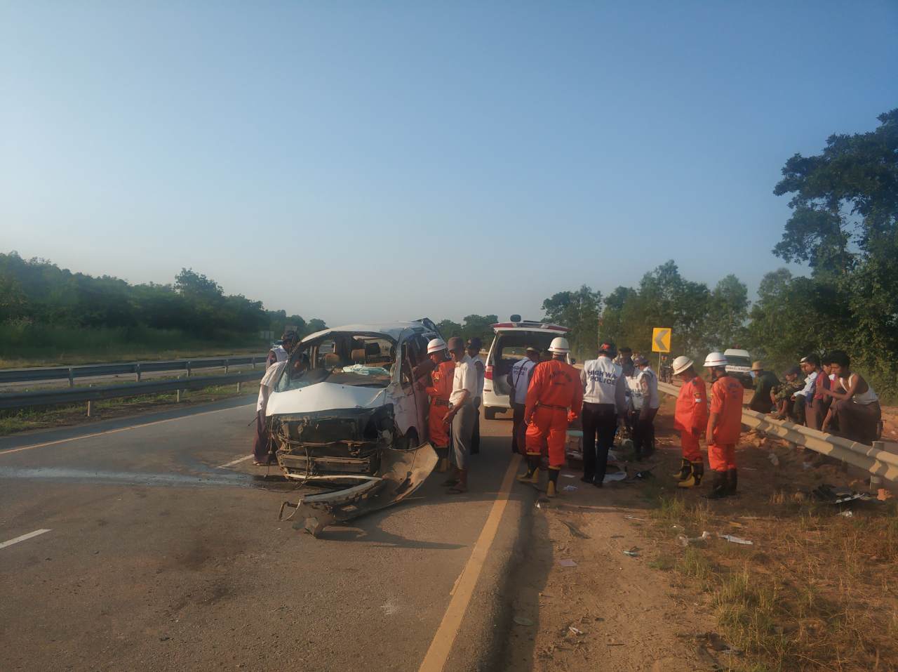 နေပြည်တော်-ရန်ကုန်အမြန်လမ်းမကြီး၊ မိုင်တိုင်အမှတ် (၂၀/၄) နှင့် (၂၀/၅) ကြားတွင် ယနေ့ နံနက် ၆ နာရီခွဲခန့်က နေပြည်တော်ဘက်မှ ရန်ကုန်ဘက်သို့ မောင်းနှင်လာသည့် Alphard အမျိုးအစား အဖြူရောင်ယာဉ်သည် လမ်းအကွေ့တွင် အရှိန်မထိန်းနိုင်ပဲ လမ်းဘေး Guard rails တန်းအား ဝင်ရောက်တိုက်မိ တိမ်းမှောက်မှုဖြစ်ပွားခဲ့သည်။