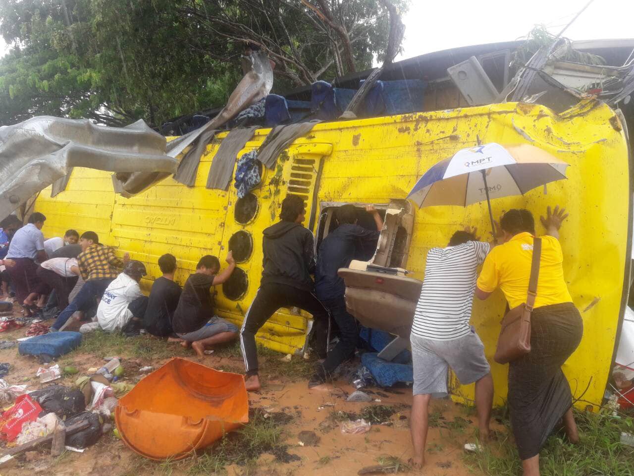 ယာဉ်တိမ်းမှောက်ရာသို့ အမြန်လမ်းမကြီး ရဲတပ်ဖွဲ့မှ အင်အားများနှင့် အထောက်အကူပြု အင်အားများ ကူညီဆောင်ရွက်ပေးလျက်ရှိပြီး ယာဉ်ပေါ်ပါ ခရီးသည်(၅၁)ဦးအနက် ဒဏ်ရာရသူများပြားပြီး အမျိုးသမီးတစ်ဦး သေဆုံးခဲ့ကြောင်း ကနဦးသိရသည်။