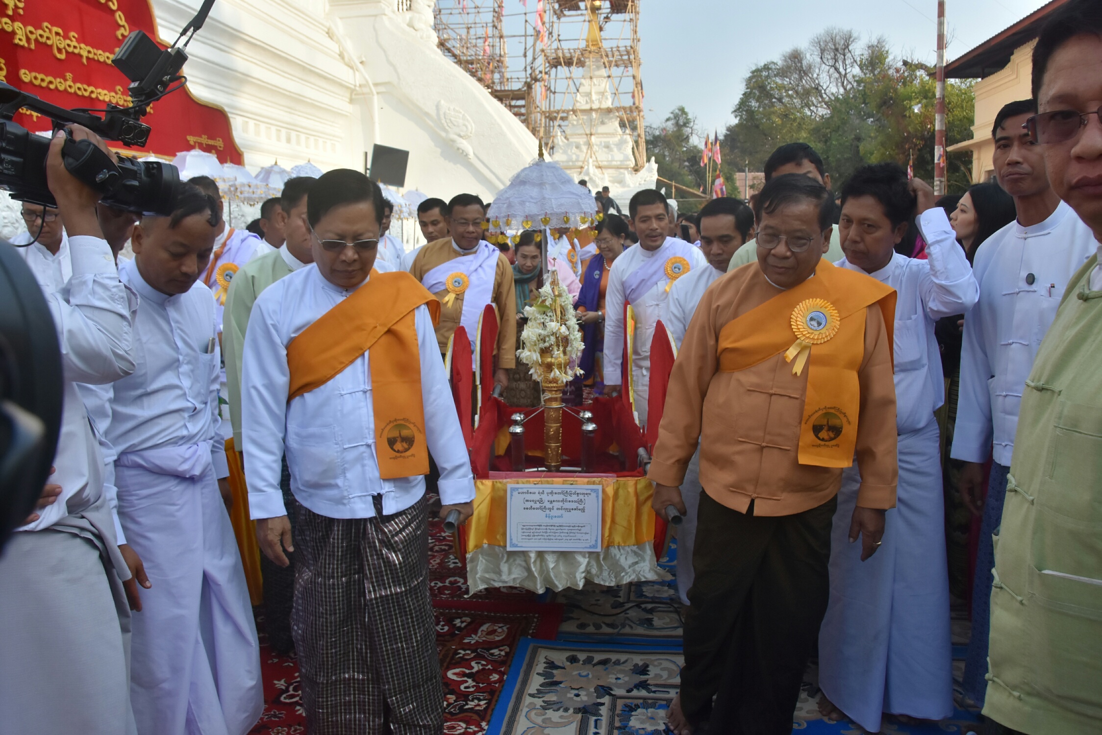 ထို့နောက် ပြည်ထောင်စုဝန်ကြီး၊ တိုင်းဒေသကြီးဝန်ကြီးချုပ်၊ တိုင်းဒေသကြီးလွှတ်တော် ဥက္ကဋ္ဌနှင့်အဖွဲ့ဝင်များ၊ မတည်အလှူရှင်မိသားစုနှင့် ဘုရားဒါယကာဒါယိကာမများက ရတနာ စိန်ဖူးတော်၊ ငှက်မြတ်နားတော်၊ ရွှေစင်ရွှေသား ရွှေငှက်မြတ်နားတော်၊ ဆည်းလည်းပဒေသာ၊ ဗုဒ္ဓရုပ်ပွားတော်များ လှူဒါန်းဌာပနာများပစ္စည်းများနှင့် အရံစေတီများ၏ စိန်ဖူးတော်၊ ငှက်မြတ်နားတော်တို့ကို ပင့်ဆောင်၍ စေတီတော်အား လက်ယာရစ်လှည့်လည်ပူဇော်ကာ စေတီတော်အထွတ်သို့ မင်္ဂလာရထားပျံဖြင့် ပင့်ဆောင်တင်လှူပူဇော်ကြသည်။