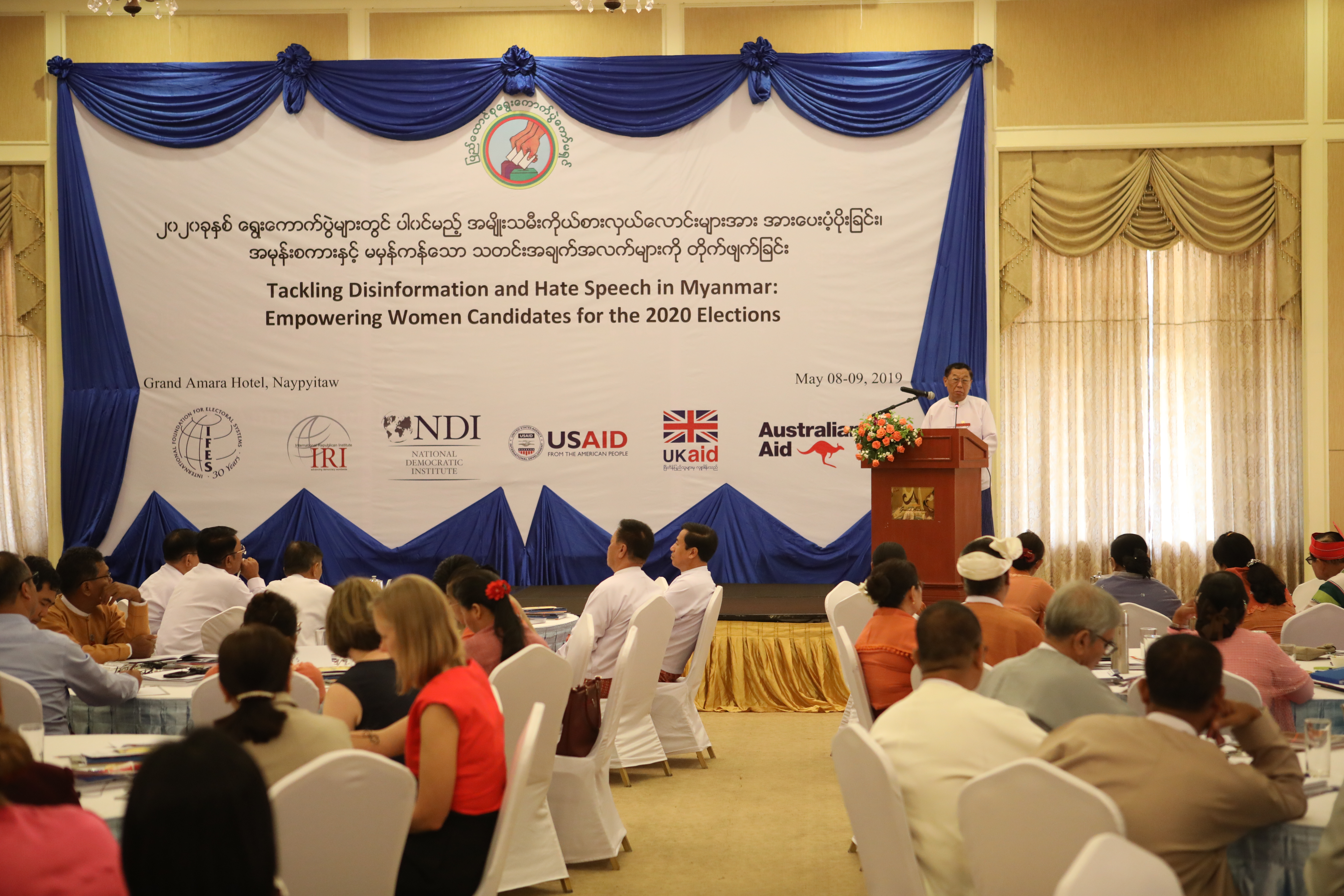 ပြည်ထောင်စုရွေးကောက်ပွဲကော်မရှင်နှင့် International Foundation for Electoral Systems (IFES)၊ International Republican Institute (IRI)၊ National Democratic Institute (NDI) တို့ ပူးပေါင်းပြုလုပ်သည့် အမုန်းစကားနှင့် မမှန်ကန်သော သတင်းအချက်အလက်များကို တိုက်ဖျက်ခြင်း၊ ၂၀၂၀ ပြည့်နှစ် အထွေထွေရွေးကောက်ပွဲတွင် ပါဝင်မည့် အမျိုးသမီး ကိုယ်စားလှယ်လောင်းများကို အားပေးပံ့ပိုးခြင်း အလုပ်ရုံဆွေးနွေးပွဲကို ယနေ့နံနက် ၉ နာရီတွင် နေပြည်တော်ရှိ Grand Amara Hotel ၌ ကျင်းပရာ ပြည်ထောင်စုရွေးကောက်ပွဲကော်မရှင် ဥက္ကဋ္ဌ ဦးလှသိန်း တက်ရောက်အမှာစကား ပြောကြားသည်။