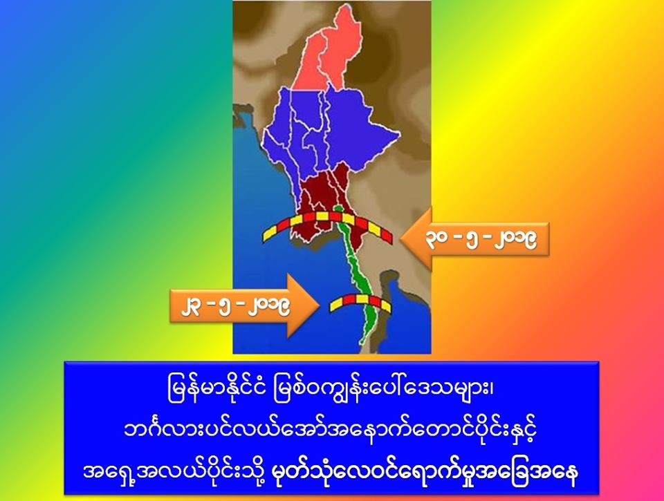 အနောက်တောင်မုတ်သုန်လေသည် လွန်ခဲ့သော(၂၄)နာရီအတွင်းက မြန်မာနိုင်ငံ မြစ်ဝကျွန်းပေါ်ဒေသများ၊ ဘင်္ဂလားပင်လယ်အော် အနောက်တောင်ပိုင်းနှင့် အရှေ့အလယ်ပိုင်းသို့ ဝင်ရောက်ခဲ့ပြီးဖြစ်ကြောင်း မိုးလေဝသနှင့် ဇလဗေဒညွှန်ကြားမှု ဦးစီးဌာနမှ ထုတ်ပြန်ထားသည်။