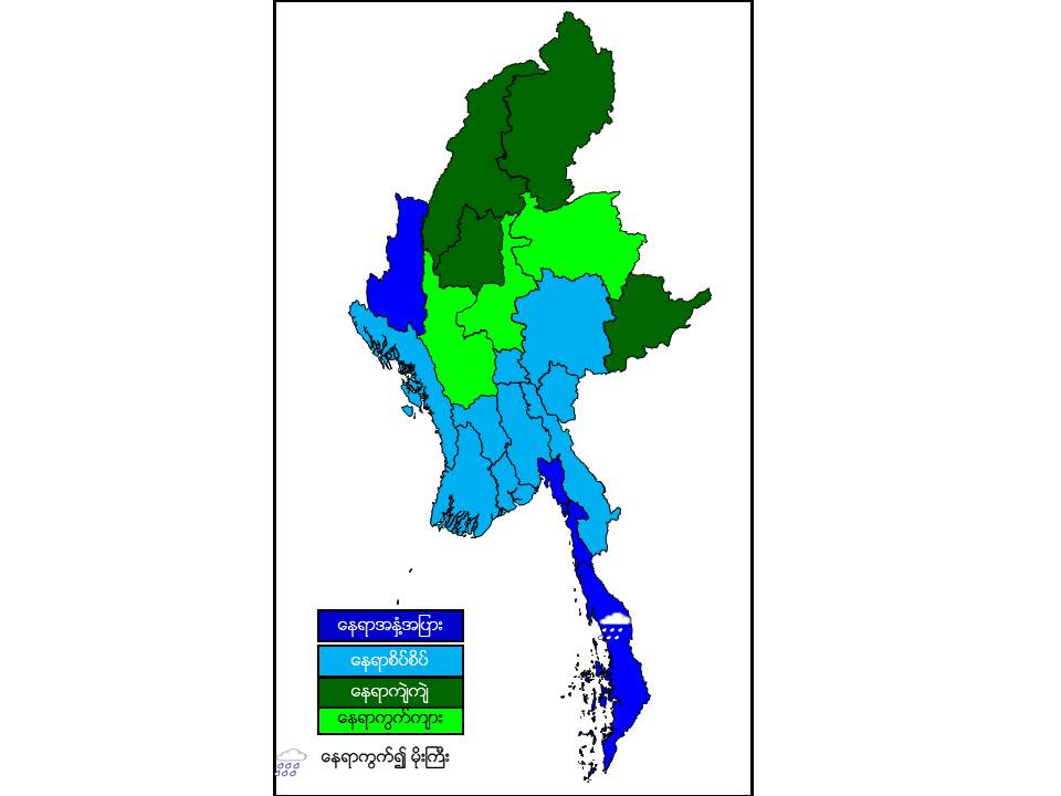 မနက်ဖြန်နံနက်အထိခန့်မှန်းချက်မှာ မန္တလေးတိုင်းဒေသကြီး၊ မကွေးတိုင်းဒေသကြီးနှင့် ရှမ်းပြည်နယ်(မြောက်ပိုင်း)တို့တွင် နေရာကွက်ကျား၊ စစ်ကိုင်းတိုင်းဒေသကြီး၊ ကချင်ပြည်နယ်နှင့် ရှမ်းပြည်နယ်(အရှေ့ပိုင်း)တို့တွင် နေရာကျဲကျဲ၊ နေပြည်တော်၊ ပဲခူးတိုင်းဒေသကြီး၊ ရန်ကုန် တိုင်းဒေသကြီး၊ ဧရာဝတီတိုင်းဒေသကြီး၊ ရှမ်းပြည်နယ်(တောင်ပိုင်း)၊ ရခိုင်ပြည်နယ်၊ ကယားပြည်နယ်နှင့် ကရင်ပြည်နယ်တို့တွင် နေရာစိပ်စိပ်နှင့် ကျန်တိုင်းဒေသကြီးနှင့် ပြည်နယ်တို့တွင် နေရာအနှံ့အပြား မိုးထစ်ချုန်းရွာပြီး၊ တနင်္သာရီတိုင်းဒေသကြီးတွင် နေရာကွက်၍ မိုးကြီးနိုင်ပါသည်။ ရွာရန်ရာနှုန်း(၈၀) ဖြစ်ပါသည်။