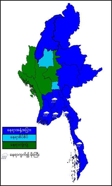 မနက်ဖြန်နံနက်အထိခန့်မှန်းချက်။ မန္တလေးတိုင်းဒေသကြီး၊ မကွေးတိုင်းဒေသကြီး၊ ချင်းပြည်နယ်နှင့် ရခိုင်ပြည်နယ်တို့တွင် နေရာကျဲကျဲ၊ နေပြည်တော်နှင့် စစ်ကိုင်းတိုင်းဒေသကြီးအောက်ပိုင်းတို့တွင် နေရာစိပ်စိပ်နှင့် ကျန်တိုင်းဒေသကြီးနှင့် ပြည်နယ်တို့တွင် နေရာအနှံ့အပြား မိုးထစ်ချုန်းရွာပြီး၊ ရန်ကုန်တိုင်းဒေသကြီး၊ ပဲခူးတိုင်းဒေသကြီး၊ ဧရာဝတီတိုင်းဒေသကြီး၊ တနင်္သာရီတိုင်းဒေသကြီးနှင့် မွန်ပြည်နယ်တို့တွင် နေရာကွက်၍ မိုးကြီးနိုင်ပါသည်။ ရွာရန်ရာနှုန်းပြည့် ဖြစ်ပါသည်။