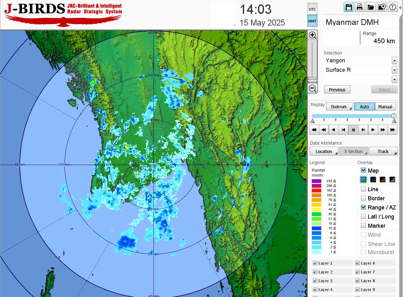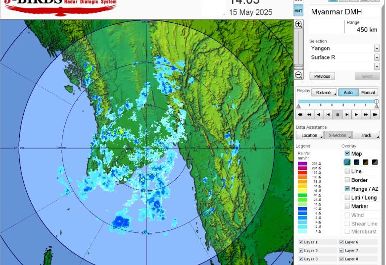 မိုးတိမ်တောင်ဖြစ်ပေါ်မှုအခြေအနေ။ ရန်ကုန်တိုင်းဒေသကြီး၊ ပဲခူးတိုင်းဒေသကြီး၊ ဧရာဝတီတိုင်းဒေသကြီး၊ တနင်္သာရီတိုင်းဒေသကြီး၊ ကရင်ပြည်နယ်၊ မွန်ပြည်နယ်နှင့် ရှမ်းပြည်နယ်(မြောက်ပိုင်းနှင့် အရှေ့ပိုင်း)တို့တွင် မိုးတိမ်တောင်များ ဖြစ်ထွန်းလျက်ရှိပြီး၊ အဆိုပါ မိုးတိမ်တောင်များ ရွေ့လျားရာနေရာတစ်လျှောက်တွင် မိုးရွာသွန်းခြင်းနှင့်အတူ လေပြင်းတိုက်ခတ်ခြင်း၊ မိုးထစ်ချုန်းခြင်း၊ မိုးကြိုးပစ်ခြင်း၊ လျှပ်စီးလက်ခြင်းနှင့် မိုးသီးကြွေခြင်းစသည့် မိုးလေဝသဖြစ်စဉ်များ ဖြစ်ပေါ်နိုင်ပါသဖြင့် ကြိုတင်သတိပြုနိုင်ပါရန် အကြံပြုအပ်ပါသည်။