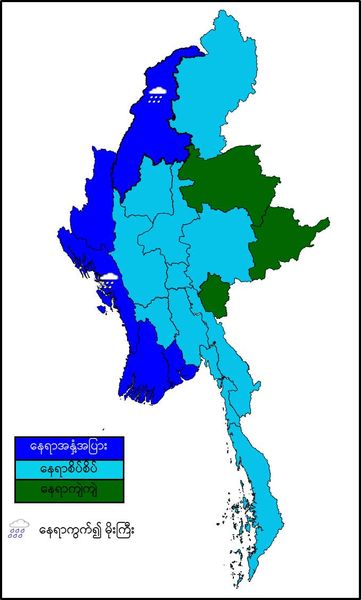 မြန်မာ့ပင်လယ်ပြင်။ မြစ်ဝကျွန်းပေါ်၊ ရခိုင်ကမ်းရိုးတန်းတစ်လျှောက်နှင့် ကမ်းလွန်ပင်လယ်ပြင်တို့တွင် တစ်ခါတစ်ရံ မိုးသက်လေပြင်းများကျရောက်ပြီး လှိုင်းအသင့်အတင့်မှ လှိုင်းကြီးနိုင်ပါသည်။ မိုးသက်လေပြင်းကျစဉ် ရေပြင်/မြေပြင်လေသည် တစ်နာရီလျှင် မိုင် ၃၀ မှ ၃၅ မိုင်အထိ တိုက်ခတ်နိုင်ပါသည်။ လှိုင်းအမြင့်မှာ မြစ်ဝကျွန်းပေါ်၊ ရခိုင်ကမ်းရိုးတန်းတစ်လျှောက်နှင့် ကမ်းလွန်ပင်လယ်ပြင်တို့တွင် ၈ ပေမှ ၁၀ ပေခန့် ရှိနိုင်ပါသည်။ ကျန်မြန်မာ့ပင်လယ်ပြင်တွင် လှိုင်းအသင့်အတင့်ရှိမည်။ လှိုင်းအမြင့်မှာ မုတ္တမကွေ့၊ မွန်-တနင်္သာရီကမ်းရိုးတန်းတစ်လျှောက်နှင့် ကမ်းလွန်ပင်လယ်ပြင်တို့တွင် ၆ ပေမှ ၈ ပေခန့်ရှိနိုင်ပါသည်။