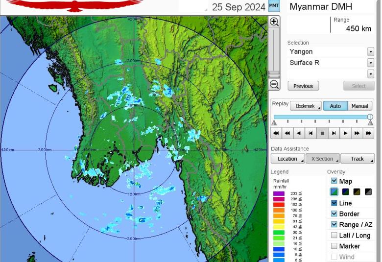 ယမန်နေ့နံနက်(၀၉:၃၀)နာရီအချိန်မှ ယနေ့နံနက်(၀၉:၃၀)နာရီအချိန်အထိ မိုးလေဝသ တိုင်းထွာချက်အကျဉ်းချုပ်။ လွန်ခဲ့သော(၂၄)နာရီအတွင်းက ရှမ်းပြည်နယ် (မြောက်ပိုင်း) တွင် နေရာကွက်ကျား၊ နေပြည်တော်နှင့် ရှမ်းပြည်နယ် (အရှေ့ပိုင်း) တို့တွင် နေရာကျဲကျဲ၊ တနင်္သာရီတိုင်းဒေသကြီး၊ ကချင်ပြည်နယ်၊ ကယားပြည်နယ်နှင့် မွန်ပြည်နယ်တို့တွင် နေရာစိပ်စိပ်နှင့် ကျန်တိုင်းဒေသကြီးနှင့် ပြည်နယ်တို့တွင် နေရာအနှံ့အပြား မိုးထစ်ချုန်းရွာခဲ့ပါသည်။ မှတ်သားဖွယ်ရာ မိုးရေချိန်များမှာ ခရမ်းမြို့တွင် ၂.၄၄ လက်မ၊ သာပေါင်းမြို့တွင် ၂.၄၀ လက်မ၊ မှော်ဘီမြို့တွင် ၂.၃၂ လက်မ၊ ဆိပ်သာမြို့နှင့် ကမမောင်းမြို့တို့တွင် ၂.၂၈ လက်မစီ၊ ဘိုကလေးမြို့တွင် ၂.၂၅ လက်မ၊ ဘီးလင်းမြို့တွင် ၁.၉၂ လက်မ၊ ညောင်ရွှေမြို့တွင် ၁.၇၈ လက်မနှင့် မင်းကင်းမြို့နှင့် ကျိုက်လတ်မြို့တို့တွင် ၁.၇၀ လက်မစီတို့ ဖြစ်ကြပါသည်။