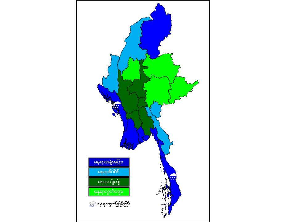 မနက်ဖြန်နံနက်အထိခန့်မှန်းချက်။ စစ်ကိုင်းတိုင်းဒေသကြီးအောက်ပိုင်းနှင့် ရှမ်းပြည်နယ်တို့တွင် နေရာကွက်ကျား၊ နေပြည်တော်၊မန္တလေး တိုင်းဒေသကြီး၊ မကွေးတိုင်းဒေသကြီးနှင့် ပဲခူးတိုင်းဒေသကြီးတို့တွင် နေရာကျဲကျဲ၊ စစ်ကိုင်းတိုင်းဒေသကြီးအထက်ပိုင်း၊ ချင်းပြည်နယ်၊ကယားပြည်နယ်နှင့် ကရင်ပြည်နယ်တို့တွင် နေရာစိပ်စိပ်နှင့်ကျန်တိုင်းဒေသကြီးနှင့် ပြည်နယ်တို့တွင် နေရာအနှံ့အပြား မိုးထစ်ချုန်းရွာပြီး၊တနင်္သာရီတိုင်းဒေသကြီးနှင့် ရခိုင်ပြည်နယ်တို့တွင် နေရာကွက်၍ မိုးကြီးနိုင်ပါသည်။ ရွာရန်ရာနှုန်းပြည့် ဖြစ်ပါသည်။