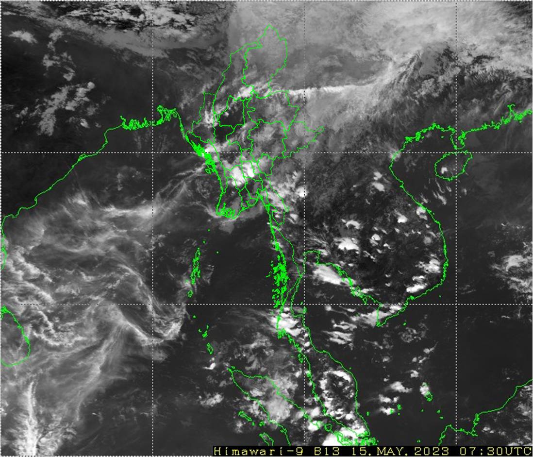 မိုးတိမ်တောင်ဖြစ်ပေါ်မှုအခြေအနေ။ မကွေးတိုင်းဒေသကြီး၊ ပဲခူးတိုင်းဒေသကြီး၊ ကရင်ပြည်နယ်နှင့် မွန်ပြည်နယ်တို့တွင် မိုးတိမ်တောင်များဖြစ်ထွန်းနေပြီး၊ အဆိုပါ မိုးတိမ်တောင်များရွေ့လျားရာနေရာတစ်လျှောက်တွင် မိုးရွာသွန်းခြင်းနှင့်အတူလေပြင်းတိုက်ခတ်ခြင်း၊ မိုးထစ်ချုန်းခြင်း၊ မိုးကြိုးပစ်ခြင်း၊ လျှပ်စီးလက်ခြင်းနှင့် မိုးသီးကြွေခြင်းစသည့် မိုးလေဝသဖြစ်စဉ်များ ဖြစ်ပေါ်နိုင်ပါသဖြင့် ကြိုတင်သတိပြုနိုင်ပါရန် အကြံပြုအပ်ပါသည်။
