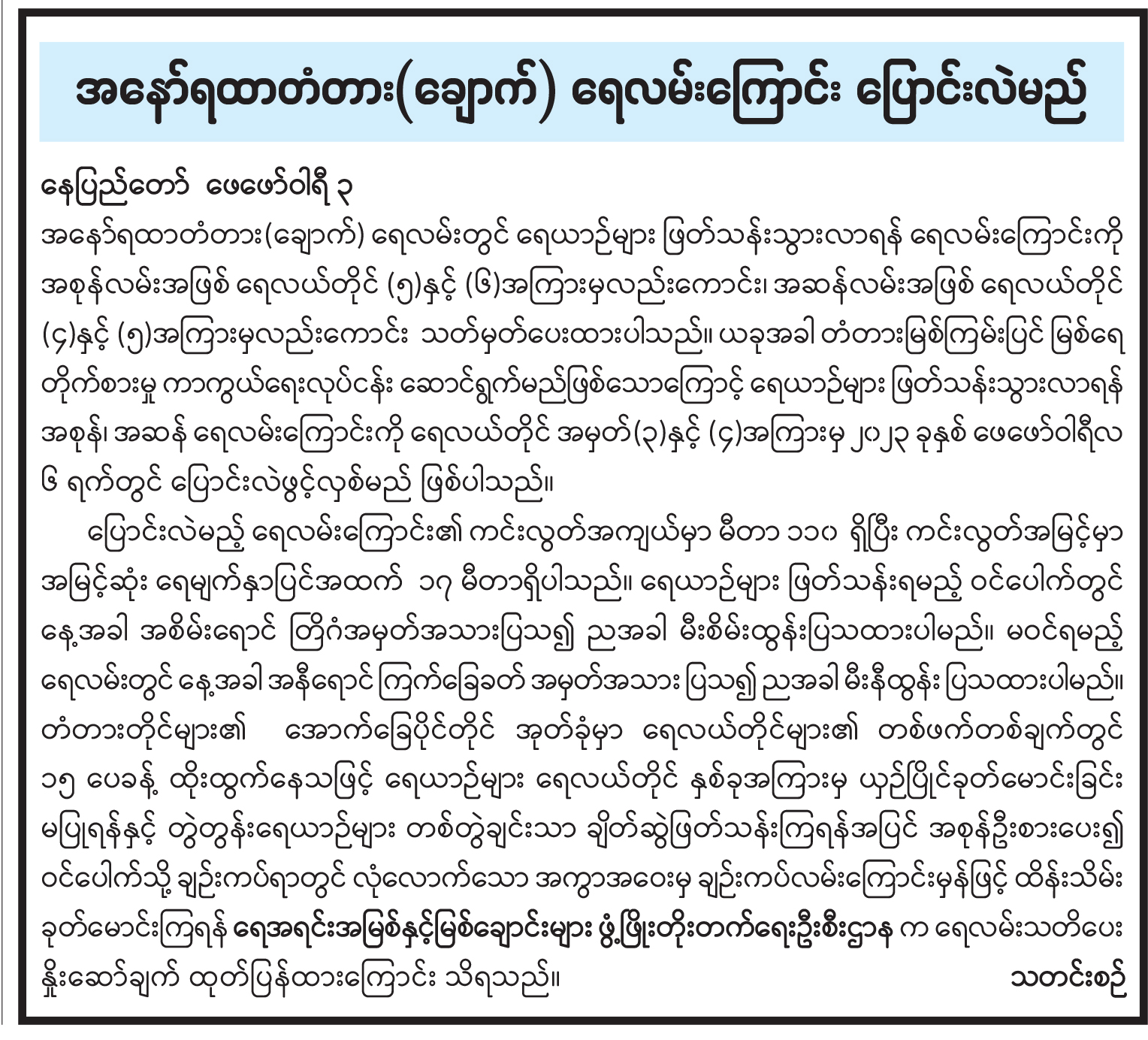 အနော်ရထာတံတား(ချောက်) ရေလမ်းကြောင်း ပြောင်းလဲမည်