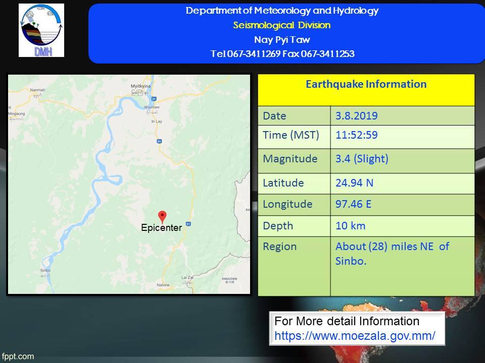 ၂၀၁၉ ခုနှစ်၊ သြဂုတ်လ (၃) ရက်နေ့၊ မြန်မာစံတော်ချိန် (၁၁)နာရီ၊ (၅၂)မိနစ်၊ (၅၉)စက္ကန့်အချိန်တွင် မြစ်ကြီးနားမြေငလျင်စခန်းမှ တောင်-အရှေ့တောင်ဘက် မိုင် (၃၀) ခန့်ကွာဝေးသော မြန်မာနိုင်ငံပြည်တွင်း (ဆင်ဘိုမြို့၏ အရှေ့မြောက်ဘက် (၂၈)မိုင်ခန့်အကွာ) မြောက်လတ္တီတွဒ် (၂၄.၉၄)ဒီဂရီ၊ အရှေ့လောင်ဂျီတွဒ် (၉၇.၄၆) ဒီဂရီ၊ အနက် (၁၀)ကီလိုမီတာကို ဗဟိုပြု၍ အင်အား ရစ်(ခ်)တာစကေး (၃.၄) အဆင့်ရှိ အင်အားအနည်းငယ်ရှိသော မြေငလျင်တစ်ခု လှုပ်ရှားသွားကြောင်း မိုးဇလဌာနမှ ထုတ်ပြန်ထားသည်။
