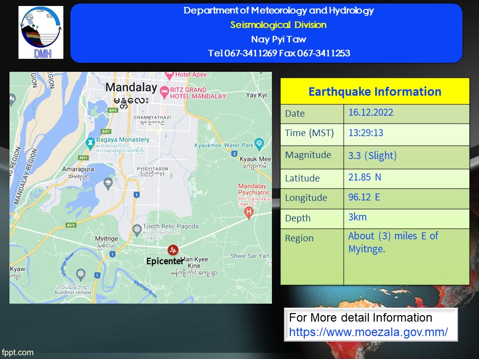 ၂၀၂၂ ခုနှစ်၊ ဒီဇင်ဘာလ (၁၆)ရက်နေ့၊ မြန်မာစံတော်ချိန် (၁၃)နာရီ၊ (၂၉)မိနစ်၊ (၁၃) စက္ကန့်အချိန်တွင် မန္တလေးမြေငလျင်စခန်းမှ တောင်ဘက် (၁၁)မိုင် ခန့်ကွာဝေးသော မြန်မာနိုင်ငံ ပြည်တွင်း (မြစ်ငယ်မြို့၏ အရှေ့ဘက် (၃)မိုင် ခန့်အကွာ) မြောက်လတ္တီတွဒ် (၂၁.၈၅)ဒီဂရီ၊ အရှေ့လောင်ဂျီတွဒ် (၉၆.၁၂)ဒီဂရီ၊ အနက် (၃)ကီလိုမီတာကို ဗဟိုပြု၍ အင်အားရစ်(ခ်)တာ စကေး (၃.၃) အဆင့်ရှိ အင်အားအနည်းငယ်ရှိသော မြေငလျင်တစ်ခု လှုပ်ရှားသွားကြောင်း တိုင်းထွာရရှိပါသည်။