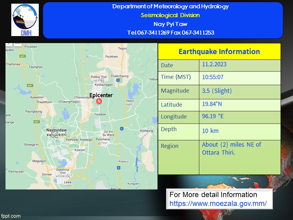 ၂၀၂၃ ခုနှစ်၊ ဖေဖော်ဝါရီလ (၁၁)ရက်နေ့၊ မြန်မာစံတော်ချိန် (၁၀)နာရီ၊ (၅၅)မိနစ်၊ (၀၇)စက္ကန့် အချိန်တွင် နေပြည်တော်မြေငလျင်စခန်းမှ အရှေ့မြောက်ဘက် (၅)မိုင်ခန့် ကွာဝေးသော မြန်မာနိုင်ငံ ပြည်တွင်း (ဥတ္တရသီရိမြို့၏ အရှေ့မြောက်ဘက် (၂)ခန့်အကွာ) မြောက်လတ္တီတွဒ် (၁၉.၈၄) ဒီဂရီ၊ အရှေ့လောင်ဂျီတွဒ် (၉၆.၁၉)ဒီဂရီ၊ အနက် (၁၀)ကီလိုမီတာကို ဗဟိုပြု၍ အင်အားရစ်(ခ်)တာစကေး (၃.၅) အဆင့်ရှိ အင်အားအနည်းငယ်ရှိသော မြေငလျင်တစ်ခု လှုပ်ရှားသွားကြောင်း တိုင်းထွာ ရရှိပါသည်။
