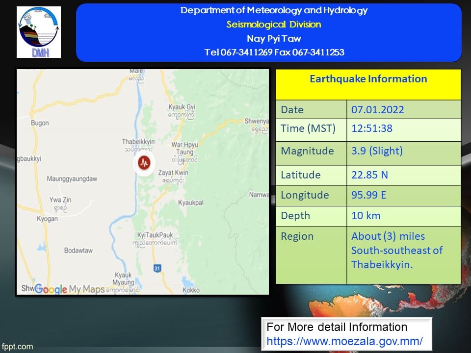 ၂၀၂၂ ခုနှစ်၊ ဇန်နဝါရီလ (၇)ရက်နေ့၊ မြန်မာစံတော်ချိန် (၁၂)နာရီ၊ (၅၁)မိနစ်၊ (၃၈)စက္ကန့် အချိန်တွင် ကန့်ဘလူမြေငလျင်စခန်းမှ အရှေ့တောင်ဘက် (၃၆)မိုင်ခန့် ကွာဝေးသော မြန်မာနိုင်ငံပြည်တွင်း (သပိတ်ကျင်းမြို့၏ တောင်-အရှေ့တောင်ဘက် (၃)မိုင်ခန့်အကွာ)၊ မြောက်လတ္တီတွဒ် (၂၂.၈၅)ဒီဂရီ၊ အရှေ့ လောင်ဂျီတွဒ် (၉၅.၉၉)ဒီဂရီ၊ အနက်(၁၀) ကီလိုမီတာကို ဗဟိုပြု၍ အင်အား ရစ်(ခ်)တာစကေး (၃.၉) အဆင့်ရှိ အင်အားအနည်းငယ်ရှိသော မြေငလျင်တစ်ခု လှုပ်ရှားသွားကြောင်း တိုင်းထွာ ရရှိပါသည်။