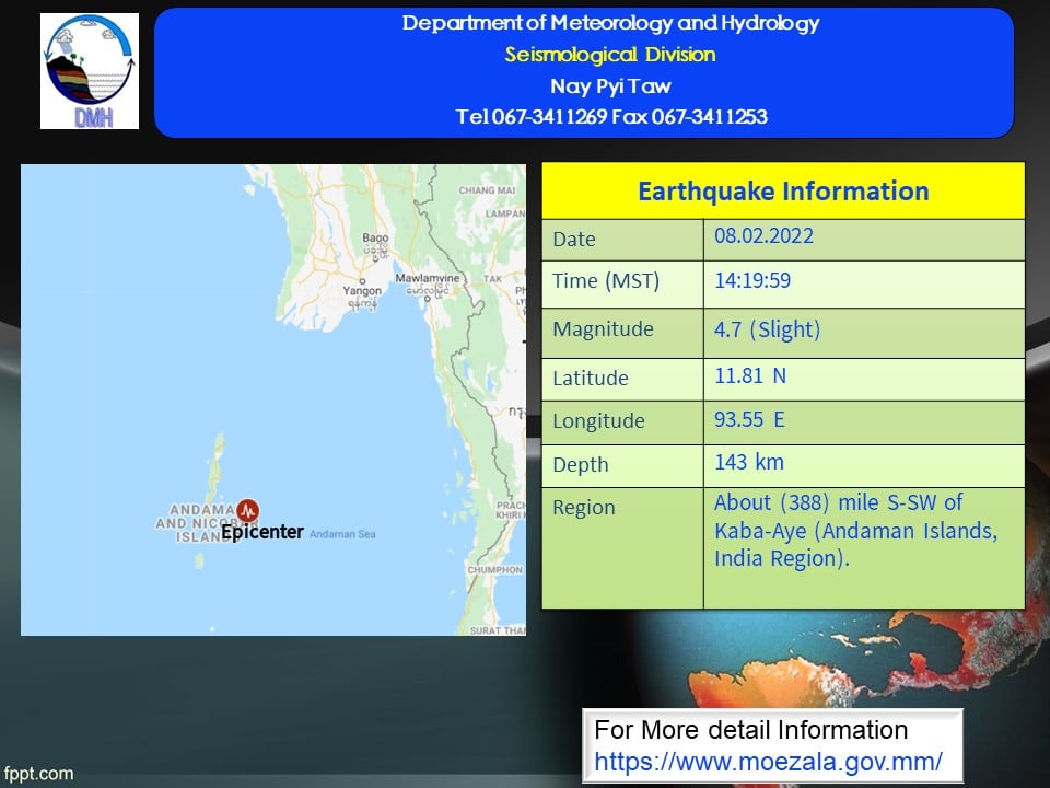 ၂၀၂၂ ခုနှစ်၊ ဖေဖော်ဝါရီလ (၈)ရက်နေ့၊ မြန်မာစံတော်ချိန် (၁၄)နာရီ၊ (၁၉)မိနစ်၊ (၅၉) စက္ကန့်အချိန်တွင် ကမ္ဘာအေးမြေငလျင်စခန်းမှ တောင်-အနောက်တောင်ဘက် (၃၈၈)မိုင်ခန့် ကွာဝေးသော မြန်မာနိုင်ငံပြည်ပ (Andaman Islands, India Region)၊ မြောက်လတ္တီတွဒ် (၁၁.၈၁) ဒီဂရီ၊ အရှေ့လောင်ဂျီတွဒ် (၉၃.၅၅)ဒီဂရီ၊ အနက် (၁၄၃)ကီလိုမီတာကို ဗဟိုပြု၍ အင်အားရစ်(ခ်)တာစကေး (၄.၇) အဆင့်ရှိ အင်အားအနည်းငယ်ရှိသော မြေငလျင်တစ်ခု လှုပ်ရှား သွားကြောင်း တိုင်းထွာရရှိပါသည်။