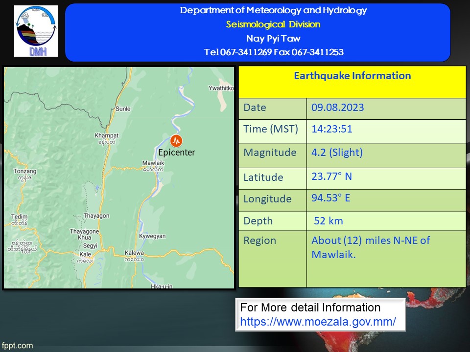 ၂၀၂၃ ခုနှစ်၊ ဩဂုတ်လ (၉) ရက်နေ့၊ မြန်မာစံတော်ချိန် (၁၄) နာရီ၊ (၂၃) မိနစ်၊ (၅၁) စက္ကန့်အချိန်တွင် တမူးမြေငလျင်စခန်းမှ အရှေ့တောင်ဘက် (၃၄) မိုင်ခန့်ကွာဝေးသော မြန်မာနိုင်ငံ ပြည်တွင်း (မော်လိုက်မြို့၏ မြောက်-အရှေ့မြောက်ဘက် (၁၂) မိုင်ခန့်အကွာ)၊ မြောက်လတ္တီတွဒ် (၂၃.၇၇) ဒီဂရီ၊ အရှေ့လောင်ဂျီတွဒ် (၉၄.၅၃) ဒီဂရီ၊ အနက် (၅၂) ကီလိုမီတာကို ဗဟိုပြု၍ အင်အား ရစ်(ခ်)တာစကေး (၄.၂) အဆင့်ရှိ အင်အားအနည်းငယ်ရှိသော မြေငလျင်တစ်ခု လှုပ်ရှားသွားကြောင်း တိုင်းထွာရရှိပါသည်။