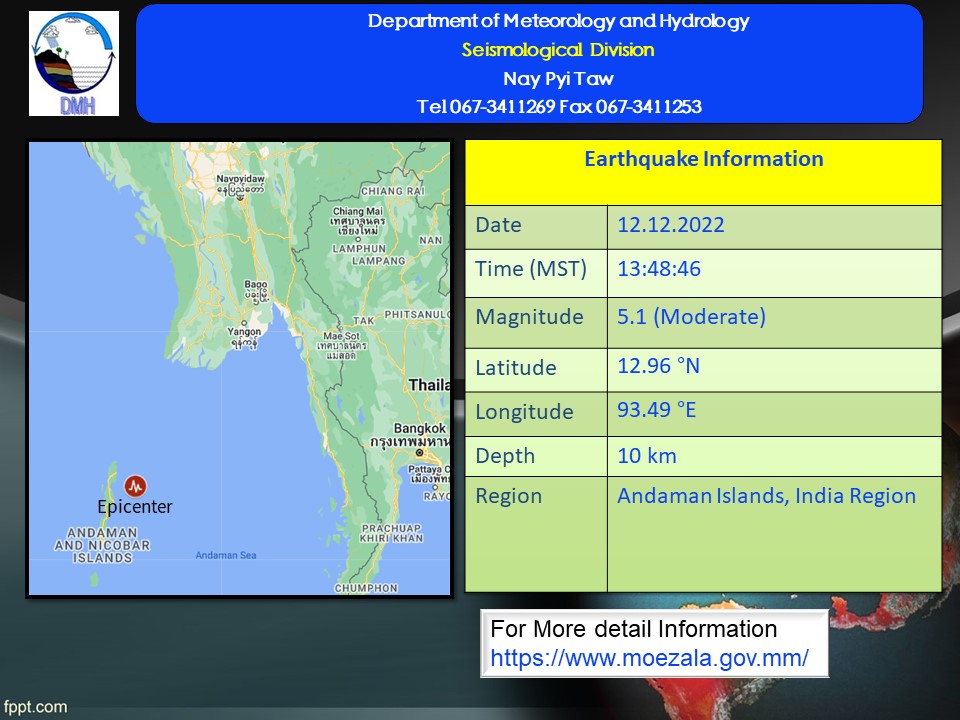 ၂၀၂၂ ခုနှစ်၊ ဒီဇင်ဘာလ (၁၂)ရက်နေ့၊ မြန်မာစံတော်ချိန် (၁၃)နာရီ၊ (၄၈)မိနစ်၊ (၄၆)စက္ကန့် အချိန်တွင် ကမ္ဘာအေးမြေငလျင်စခန်းမှ အနောက်တောင်ဘက် (၃၂၂)မိုင်ခန့်ကွာဝေးသော မြန်မာနိုင်ငံပြည်ပ (Andaman Islands, India Region)၊ မြောက်လတ္တီတွဒ် (၁၂.၉၆)ဒီဂရီ၊ အရှေ့လောင်ဂျီတွဒ် (၉၃.၄၉)ဒီဂရီ၊ အနက် (၁၀)ကီလိုမီတာခန့်ကို ဗဟိုပြု၍ အင်အား ရစ်(ခ်)တာ စကေး (၅.၁)အဆင့်ရှိ အင်အားအသင့်အတင့်ရှိသော မြေငလျင်တစ်ခု လှုပ်ရှားသွားကြောင်း တိုင်းထွာရရှိပါသည်။