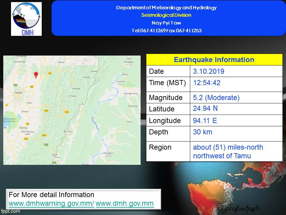 ၂၀၁၉ ခုနှစ်၊ အောက်တိုဘာလ (၃)ရက်နေ့၊ မြန်မာစံတော်ချိန် (၁၂)နာရီ၊ (၅၄)မိနစ်၊ (၄၂)စက္ကန့် အချိန်တွင် တမူးမြေငလျင်စခန်းမှ မြောက်-အနောက်မြောက်ဘက် (၅၁)မိုင် ခန့်ကွာဝေးသော မြန်မာနိုင်ငံ ပြည်ပ (Myanmar-India Border Region) မြောက်လတ္တီတွဒ် (၂၄.၉၄)ဒီဂရီ၊ အရှေ့လောင်ဂျီတွဒ် (၉၄.၁၁)ဒီဂရီ၊ အနက်(၃၀)ကီလိုမီတာကို ဗဟိုပြု၍ အင်အားရစ်(ခ်)တာစကေး (၅.၂) အဆင့်ရှိ အင်အားအသင့်အတင့်ရှိသော မြေငလျင်တစ်ခု လှုပ်ရှားသွားကြောင်း မိုးဇလမှ ထုတ်ပြန်ထားသည်။