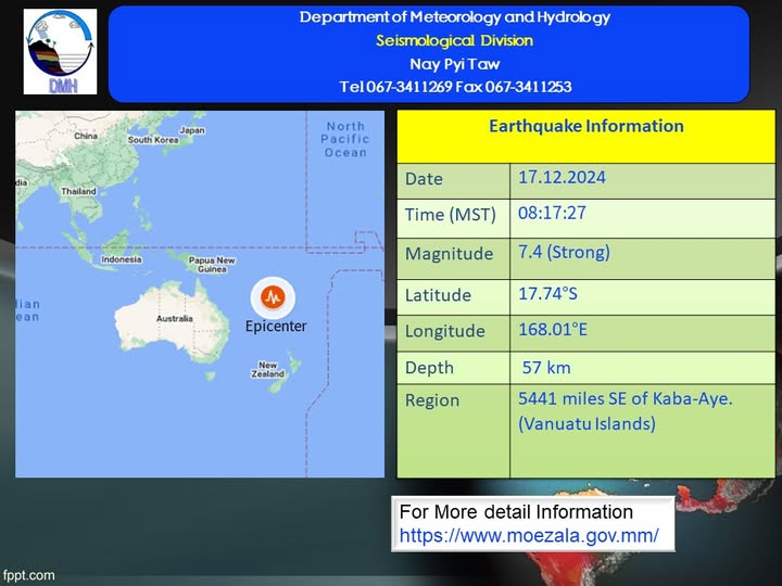 ၂၀၂၄ ခုနှစ်၊ ဒီဇင်ဘာလ ၁၇ ရက်နေ့၊ မြန်မာစံတော်ချိန် (၀၈) နာရီ၊ (၁၇) မိနစ်၊ (၂၇) စက္ကန့် အချိန်တွင် ကမ္ဘာအေးမြေလျင်စခန်းမှ အရှေ့တောင်ဘက်(၅၄၄၁) မိုင်ခန့်ကွာဝေးသော မြန်မာနိုင်ငံပြည်ပ (Vanuatu Islands) တောင်လတ္တီတွဒ် (၁၇.၇၄) ဒီဂရီ၊ အရှေ့လောင်ဂျီတွဒ် (၁၆၈.၀၁) ဒီဂရီ၊ အနက် (၅၇) ကီလိုမီတာကို ဗဟိုပြု၍ အင်အားရစ်(ခ်)တာစကေး (၇.၄) အဆင့်ရှိ အင်အားပြင်းထန်သော မြေငလျင်တစ်ခု လှုပ်ရှားသွားကြောင်း တိုင်းထွာရရှိပါသည်။