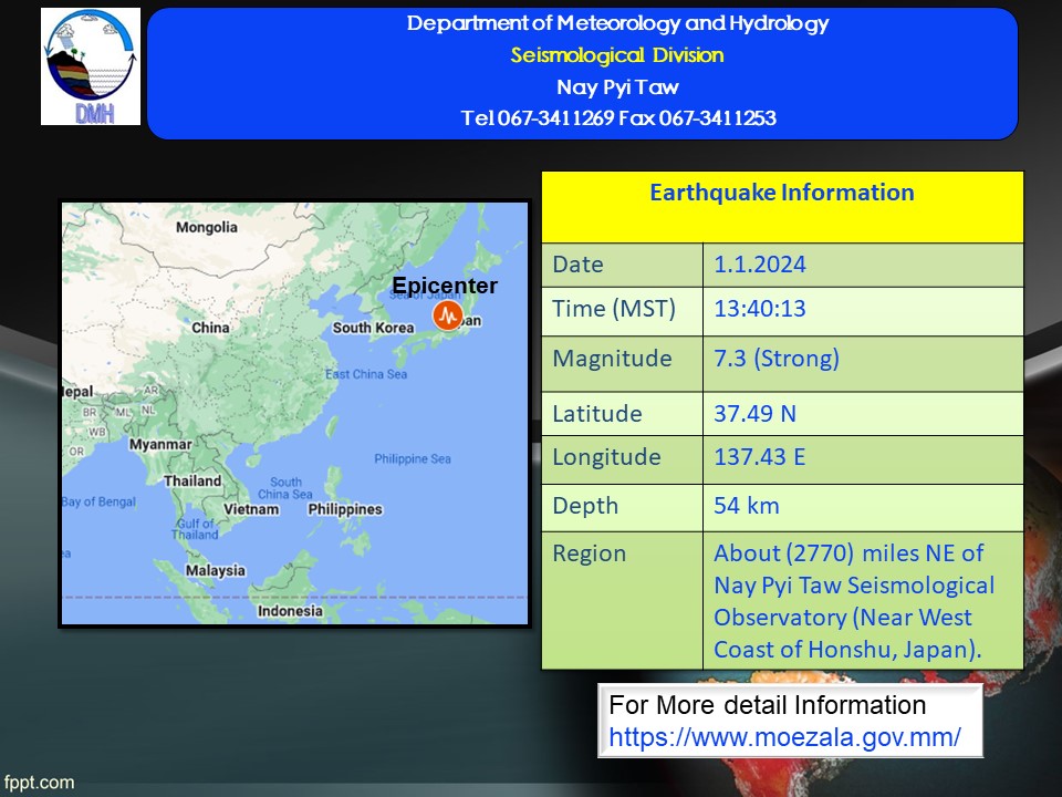 ၂၀၂၄ ခုနှစ်၊ ဇန်နဝါရီလ (၁)ရက်နေ့၊ မြန်မာစံတော်ချိန် (၁၃)နာရီ၊ (၄၀)မိနစ်၊ (၁၃) စက္ကန့် အချိန်တွင် နေပြည်တော်မြေငလျင်စခန်းမှ အရှေ့မြောက်ဘက် (၂၇၇၀) မိုင်ခန့် ကွာဝေးသော မြန်မာနိုင်ငံပြည်ပ    ( Near West Coast of Honshu, Japan )၊ မြောက်လတ္တီတွဒ် (၃၇.၄၉) ဒီဂရီ၊ အရှေ့လောင်ဂျီတွဒ် (၁၃၇.၄၃)ဒီဂရီ၊ အနက် (၅၄)ကီလိုမီတာကို ဗဟိုပြု၍ အင်အားရစ်(ခ်)တာ စကေး (၇.၃)အဆင့်ရှိ အင်အားပြင်းထန်သော မြေငလျင်တစ်ခု လှုပ်ရှားသွားကြောင်း တိုင်းထွာ ရရှိပါသည်။