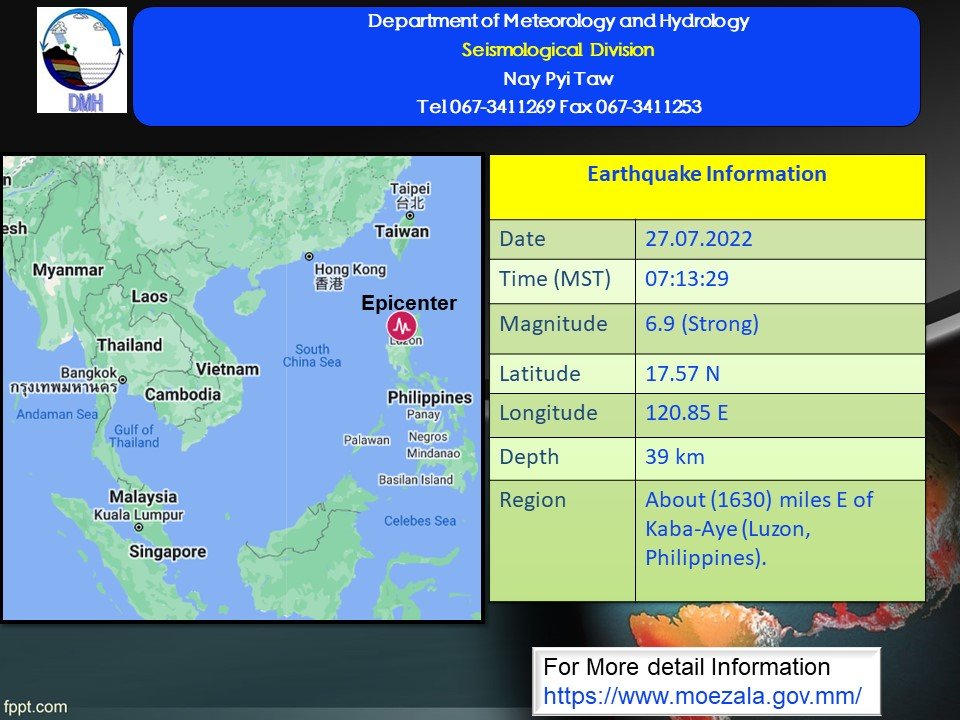 ၂၀၂၂ ခုနှစ်၊ ဇူလိုင်လ(၂၇)ရက်နေ့၊ မြန်မာစံတော်ချိန် (၀၇)နာရီ၊ (၁၃)မိနစ်၊ (၂၉)စက္ကန့် အချိန်တွင် ကမ္ဘာအေးမြေငလျင်စခန်းမှ အရှေ့ဘက် (၁၆၃၀)မိုင် ခန့်ကွာဝေးသော မြန်မာနိုင်ငံ ပြည်ပ (Luzon, Philippines)၊ မြောက်လတ္တီတွဒ် (၁၇.၅၇)ဒီဂရီ၊ အရှေ့လောင်ဂျီတွဒ် (၁၂၀.၈၅)ဒီဂရီ၊ အနက် (၃၉)ကီလိုမီတာခန့်ကို ဗဟိုပြု၍ အင်အားရစ်(ခ်)တာစကေး (၆.၉) အဆင့်ရှိ အင်အားပြင်းထန်သော မြေငလျင်တစ်ခု လှုပ်ရှားသွားကြောင်း တိုင်းထွာရရှိပါသည်။