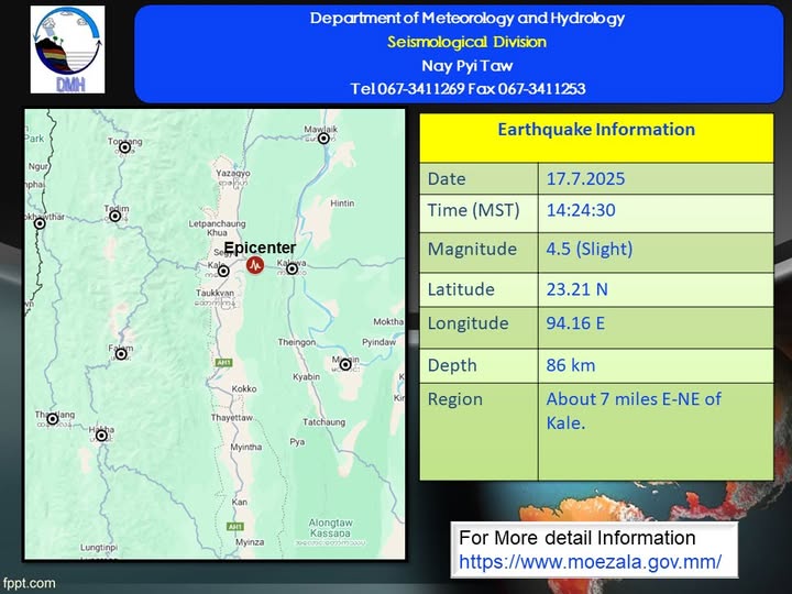 ၂၀၂၅ ခုနှစ်၊ ဇူလိုင်လ ၁၇ ရက်နေ့၊ မြန်မာစံတော်ချိန် (၁၄) နာရီ၊ (၂၄)မိနစ်၊ (၃၀)စက္ကန့် အချိန်တွင် ဟားခါးမြေငလျင်စခန်းမှ အရှေ့မြောက်ဘက် (၅၃) မိုင်ခန့်ကွာဝေးသော မြန်မာနိုင်ငံပြည်တွင်း (ကလေးမြို့၏ အရှေ့-အရှေ့မြောက်ဘက် (၇) မိုင် ခန့်အကွာ) မြောက်လတ္တီတွဒ် (၂၃.၂၁) ဒီဂရီ၊ အရှေ့လောင်ဂျီတွဒ် (၉၄.၁၆) ဒီဂရီ၊ အနက် (၈၆) ကီလိုမီတာကို ဗဟိုပြု၍ အင်အားရစ်(ခ်)တာ စကေး (၄.၅) အဆင့်ရှိ အင်အားအနည်းငယ်ရှိသော မြေငလျင်တစ်ခု လှုပ်ရှားသွားကြောင်း တိုင်းထွာရရှိပါသည်။