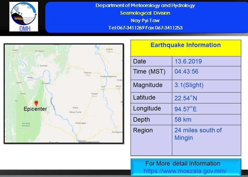၂၀၁၉ ခုနှစ် ၊ ဇွန်လ (၁၃)ရက်နေ့ မြန်မာစံတော်ချိန် (ဝ၄)နာရီ (၄၃)မိနစ် (၅၆) စက္ကန့်အချိန်တွင် ဟားခါး မြေငလျင်စခန်းမှ အရှေ့ဘက် မိုင် (၆၀) ခန့် ကွာဝေးသော မြန်မာနိုင်ငံပြည်တွင်း (မင်းကင်းမြို့၏ တောင်ဘက် (၂၄) မိုင်ခန့်အကွာ) မြောက်လတ္တီတွဒ် (၂၂ ဒသမ ၅၄)ဒီဂရီ၊ အရှေ့လောင်ဂျီတွဒ် (၉၄ ဒသမ ၅၇)ဒီဂရီ၊ အနက် (၅၈) ကီလိုမီတာခန့်ကို ဗဟိုပြု၍ အင်အားရစ်(ခ်)တာစကေး (၃ ဒသမ ၁) အဆင့်ရှိ အင်အားအနည်းငယ်ရှိသော မြေငလျင်တစ်ခု လှုပ်ရှားသွားကြောင်း မိုးလေဝသနှင့် ဇလဗေဒညွှန်ကြားမှုဦးစီးဌာန၏ တိုင်းထွာရရှိခဲ့ပါသည်။