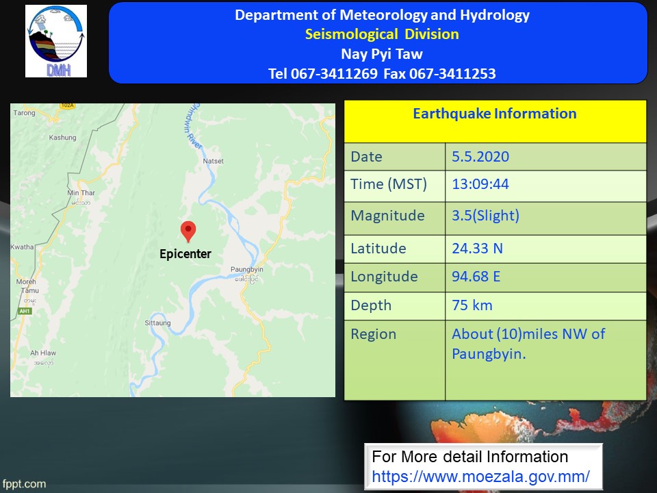 ၂၀၂၀ ပြည့်နှစ်၊ မေလ (၅) ရက်နေ့၊ မြန်မာစံတော်ချိန် (၁၃)နာရီ၊ (ဝ၉)မိနစ်၊ (၄၄) စက္ကန့်အချိန်တွင် တမူးမြေငလျင်စခန်းမှ အရှေ့-အရှေ့မြောက်ဘက် (၂၄)မိုင် ခန့်ကွာဝေးသော မြန်မာနိုင်ငံ ပြည်တွင်း (ဖောင်းပြင်မြို့၏ အနောက်မြောက်ဘက် (၁၀)မိုင်ခန့် အကွာ)၊ မြောက် လတ္တီတွဒ် (၂၄.၃၃)ဒီဂရီ၊ အရှေ့လောင်ဂျီတွဒ် (၉၄.၆၈)ဒီဂရီ၊ အနက်(၇၅)ကီလိုမီတာခန့်ကို ဗဟိုပြု၍ အင်အားရစ်(ခ်)တာစကေး (၃.၅)အဆင့်ရှိ အင်အားအနည်းငယ်ရှိသော မြေငလျင်တစ်ခုလှုပ်ရှား သွားကြောင်း တိုင်းထွာရရှိပါသည်။