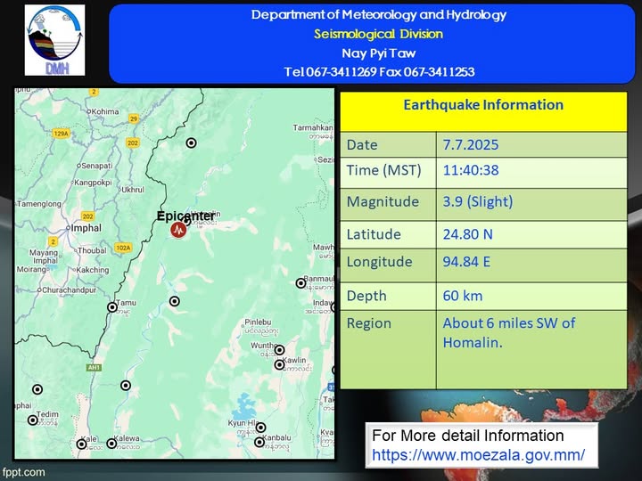 ၂၀၂၅ ခုနှစ်၊ ဇူလိုင်လ ၇ ရက်နေ့၊ မြန်မာစံတော်ချိန် (၁၁) နာရီ၊ (၄၀)မိနစ်၊ (၃၈)စက္ကန့် အချိန်တွင် တမူးမြေငလျင်စခန်းမှ အရှေ့မြောက်ဘက် (၅၂) မိုင်ခန့်ကွာဝေးသော မြန်မာနိုင်ငံပြည်တွင်း (ဟုမ္မလင်းမြို့၏ အနောက်တောင်ဘက် (၆) မိုင်ခန့်အကွာ) မြောက်လတ္တီတွဒ် (၂၄.၈၀) ဒီဂရီ၊ အရှေ့လောင်ဂျီတွဒ် (၉၄.၈၄) ဒီဂရီ၊ အနက် (၆၀) ကီလိုမီတာကို ဗဟိုပြု၍ အင်အားရစ်(ခ်)တာစကေး (၃.၉) အဆင့်ရှိ အင်အားအနည်းငယ်ရှိသော မြေငလျင်တစ်ခု လှုပ်ရှားသွားကြောင်း တိုင်းထွာရရှိပါသည်။