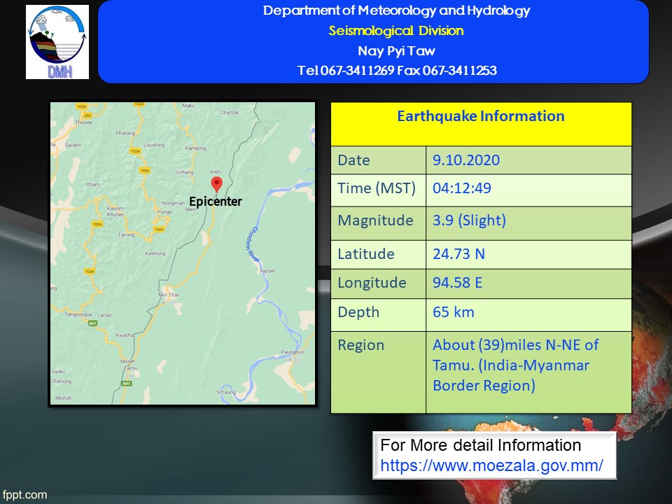 ၂၀၂၀ ပြည့်နှစ်၊ အောက်တိုဘာလ (၉)ရက်နေ့၊ မြန်မာစံတော်ချိန် (၀၄)နာရီ၊ (၁၂)မိနစ်၊ (၄၉)စက္ကန့်အချိန်တွင်  တမူးမြေငလျင်စခန်းမှ မြောက်-အရှေ့မြောက်ဘက် (၃၉)မိုင်ခန့်ကွာဝေးသော၊ မြန်မာနိုင်ငံပြည်ပ (India-Myanmar Border Region)၊ မြောက်လတ္တီတွဒ် (၂၄.၇၃) ဒီဂရီ၊ အရှေ့လောင်ဂျီတွဒ် (၉၄.၅၈)ဒီဂရီ၊ အနက် (၆၅) ကီလိုမီတာကို ဗဟိုပြု၍ အင်အားရစ်(ခ်)တာစကေး (၃.၉)အဆင့်ရှိ အင်အားအနည်းငယ်ရှိသော မြေငလျင်တစ်ခု လှုပ်ရှားသွားကြောင်း တိုင်းထွာရရှိပါသည်။