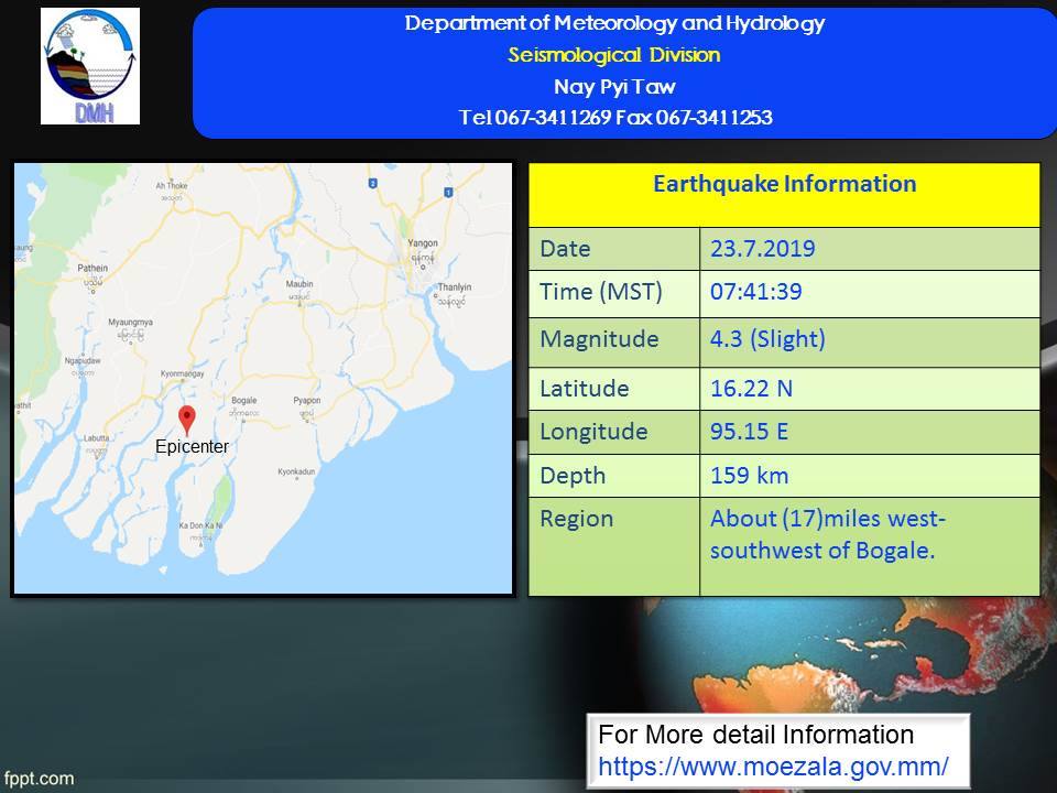 ယနေ့နံနက် မြန်မာစံတော်ချိန် ဝ၇ နာရီ ၄၁ မိနစ် ၃၉ စက္ကန့် အချိန်တွင် ကမ္ဘာအေးမြေငလျင်စခန်းမှ အနောက်တောင်ဘက် ၇၉ မိုင် ခန့်ကွာဝေးသော မြန်မာနိုင်ငံပြည်တွင်း (ဘိုကလေးမြို့၏ အနောက်-အနောက်တောင်ဘက် ၁၇ မိုင် ခန့်အကွာ) မြောက်လတ္တီတွဒ် ၁၆ ဒသမ ၂၂ ဒီဂရီ၊ အရှေ့လောင်ဂျီတွဒ် ၉၅ ဒသမ ၁၅ ဒီဂရီ၊ အနက် ၁၅၉ ကီလိုမီတာကို ဗဟိုပြု၍ အင်အားရစ်(ခ်)တာစကေး ၄ ဒသမ ၃ အဆင့်ရှိ အင်အားအနည်းငယ်ရှိသော မြေငလျင်တစ်ခု လှုပ်ရှားသွားမှုအား တိုင်းထွာရရှိခဲ့ကြောင်း မိုးလေဝသနှင့်ဇလဗေဒညွှန်ကြားမှု ဦးစီးဌာနမှ ထုတ်ပြန်ချက်အရ သိရသည်။