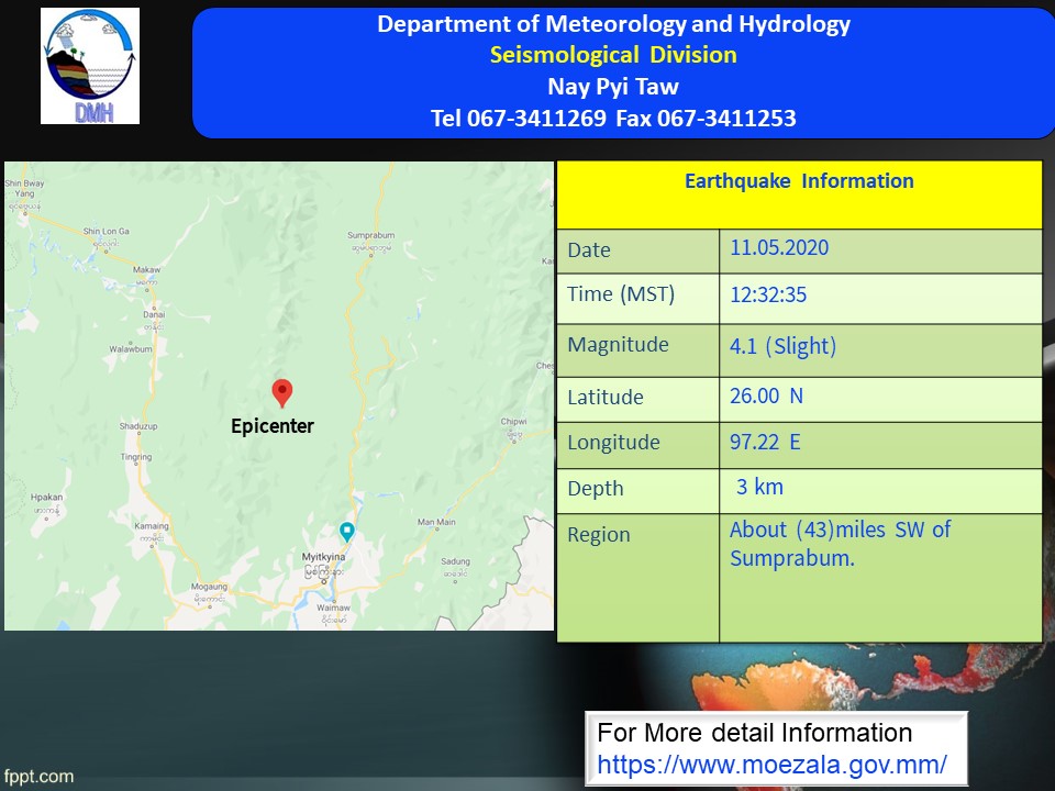 ၂၀၂၀ ပြည့်နှစ်၊ မေလ (၁၁)ရက်နေ့၊ မြန်မာစံတော်ချိန် (၁၂)နာရီ၊ (၃၂)မိနစ်၊ (၃၅)စက္ကန့် အချိန်တွင် မြစ်ကြီးနားမြေငလျင်စခန်းမှ အနောက်မြောက်ဘက် (၃၇)မိုင် ခန့်ကွာဝေးသော မြန်မာနိုင်ငံပြည်တွင်း (ဆွမ်ပရာဘွမ်မြို့၏ အနောက်တောင်ဘက် (၄၃)မိုင် ခန့်အကွာ) မြောက် လတ္တီတွဒ် (၂၆.ဝ၀)ဒီဂရီ၊ အရှေ့လောင်ဂျီတွဒ် (၉၇.၂၂)ဒီဂရီ၊ အနက် (၃)ကီလိုမီတာကို ဗဟိုပြု၍ အင်အားရစ်(ခ်)တာစကေး (၄.၁) အဆင့်ရှိ အင်အားအနည်းငယ်ရှိသော မြေငလျင်တစ်ခု လှုပ်ရှားသွားကြောင်း တိုင်းထွာရရှိပါသည်။