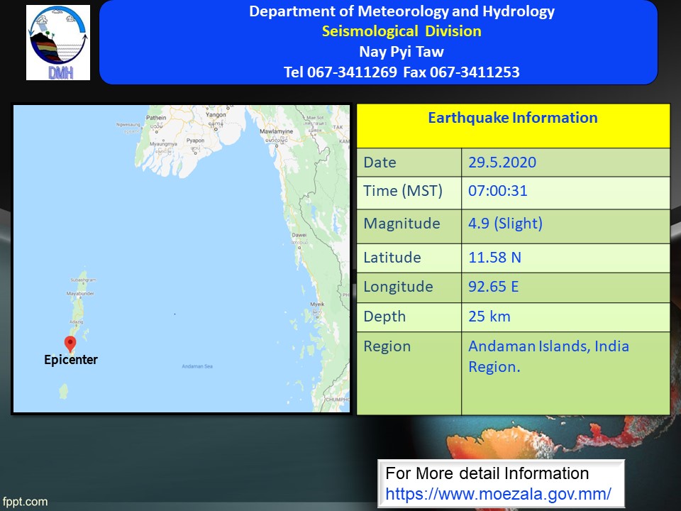 ယနေ့ မြန်မာစံတော်ချိန် (၀၇)နာရီ၊ (၀၀)မိနစ်၊ (၃၁)စက္ကန့် အချိန် တွင် အင်အားရစ်(ခ်)တာစကေး (၄.၉)အဆင့်ရှိ အင်အား အနည်းငယ်ရှိသော မြေငလျင်တစ်ခု လှုပ်ရှားသွားကြောင်း မိုးလေဝသနှင့်ဇလဗေဒညွှန်ကြားမှု ဉီးစီးဌာနမှ ထုတ်ပြန်ထားသည်။