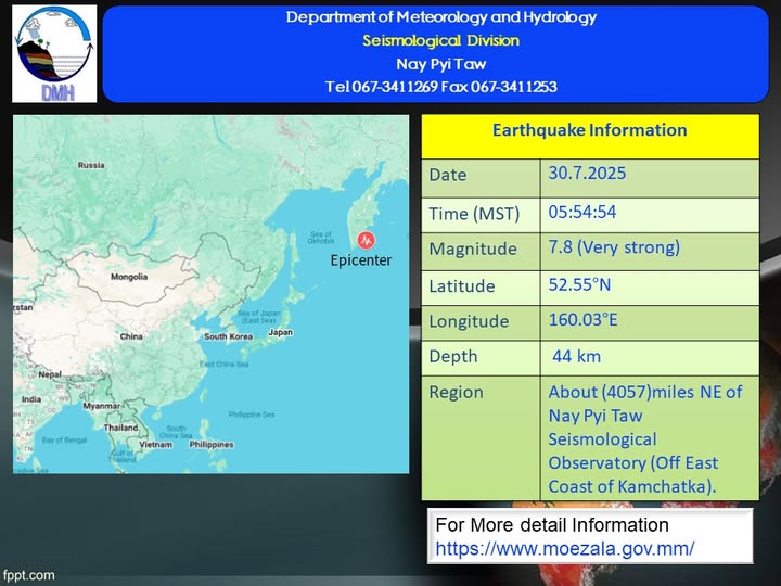 ၂၀၂၅ ခုနှစ်၊ ဇူလိုင်လ ၃၀ ရက်နေ့၊ မြန်မာစံတော်ချိန် (၀၅) နာရီ၊ (၅၄) မိနစ်၊ (၅၄) စက္ကန့် အချိန်တွင် နေပြည်တော်မြေငလျင်စခန်းမှ အရှေ့မြောက်ဘက် (၄၀၅၇) မိုင်ခန့်ကွာဝေးသော မြန်မာနိုင်ငံပြည်ပ (Off east coast of Kamchatka)၊ မြောက်လတ္တီတွဒ် (၅၂.၅၅) ဒီဂရီ၊ အရှေ့လောင်ဂျီတွဒ် (၁၆၀.၀၃) ဒီဂရီ၊ အနက် (၄၄)ကီလိုမီတာခန့်ကို ဗဟိုပြု၍ အင်အားရစ်(ခ်)တာစကေး (၇.၈) အဆင့်ရှိ အင်အားအလွန်ပြင်းထန်သော မြေငလျင်တစ်ခု လှုပ်ရှားသွားကြောင်း တိုင်းထွာရရှိပါသည်။