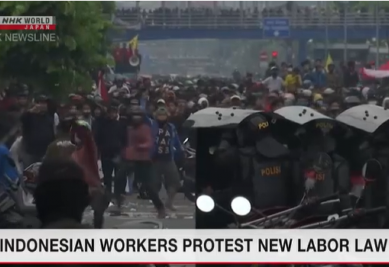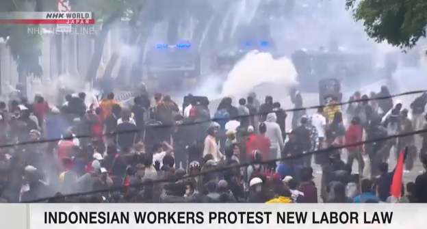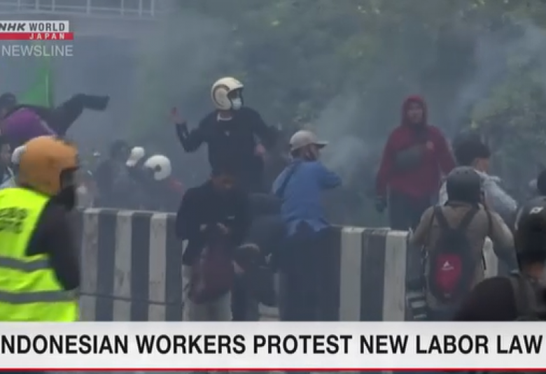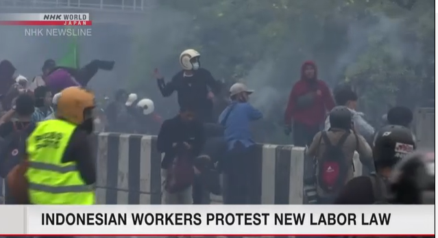 အင်ဒိုနီးရှားနိုင်ငံတစ်ဝန်းတွင် အလုပ်သမားအခွင့်အရေးများကို ခြိမ်းခြောက်နေသော ဉပဒေသစ်တစ်ရပ်ကို ကန့်ကွက်ဆန္ဒပြရန် သောင်းနှင့်ချီသောလူများသည် လမ်းများပေါ်သို့ ချီတက်ခဲ့ကြသည်။