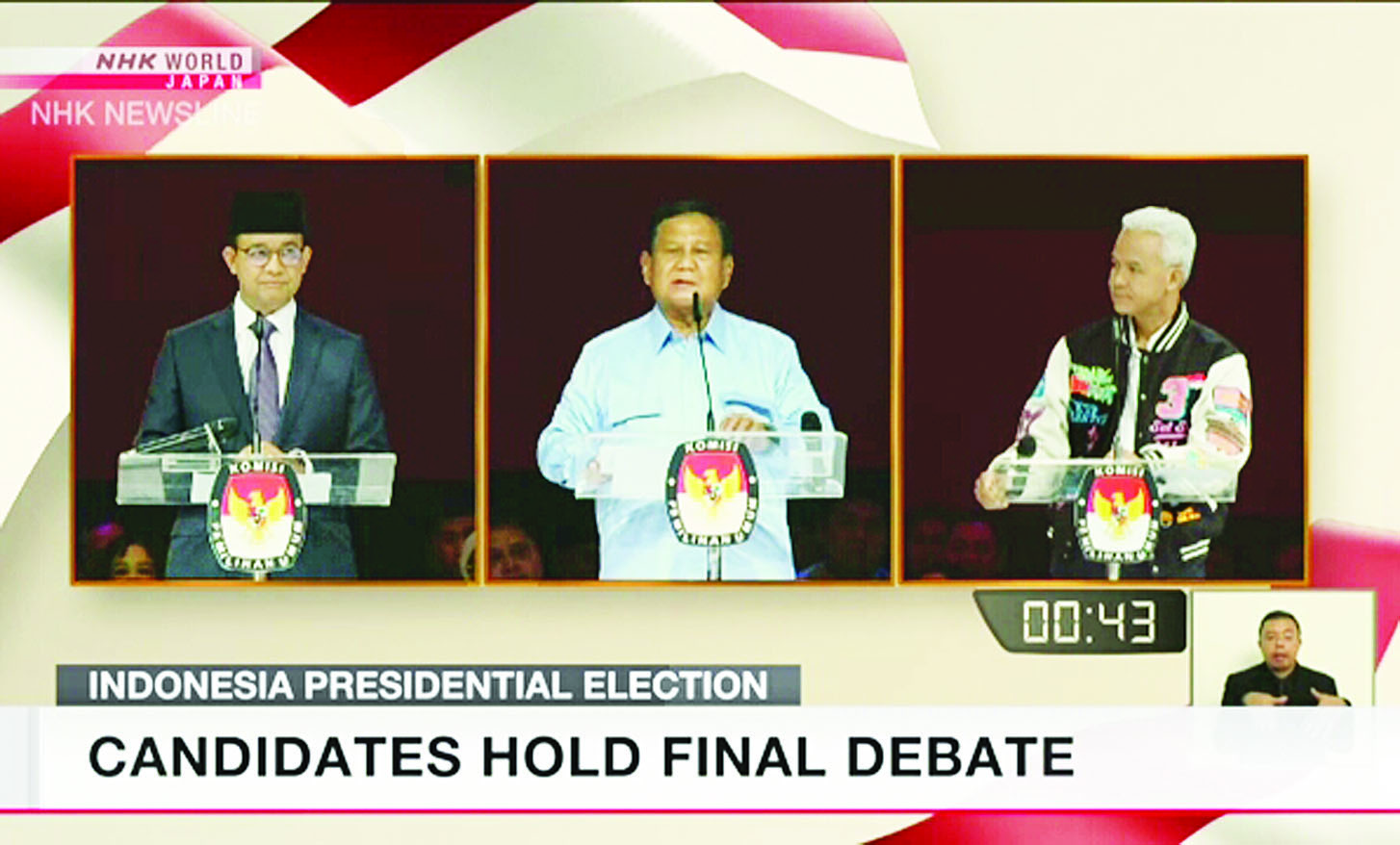 အင်ဒိုနီးရှားသမ္မတ ကိုယ်စားလှယ်လောင်းများသည် ဖေဖော်ဝါရီ ၁၄ ရက် ဆန္ဒမဲပေးပွဲမတိုင်မီ နောက်ဆုံး စကားစစ်ထိုးပွဲတွင် ပါဝင်ခဲ့ကြသည်။ အင်ဒိုနီးရှားသမ္မတ ကိုယ်စားလှယ်လောင်းသုံးဦးသည် လက်ရှိသမ္မတ ဂျိုကိုဝီဒိုဒို၏ မူဝါဒများကို ဆက်လက်လိုက်နာသည်ဖြစ်စေ၊ မလိုက်နာသည်ဖြစ်စေ မဲဆန္ဒရှင်များကို ဆွဲဆောင်နိုင်ရေး အပြိုင်စည်းရုံးလျက်ရှိသည်။