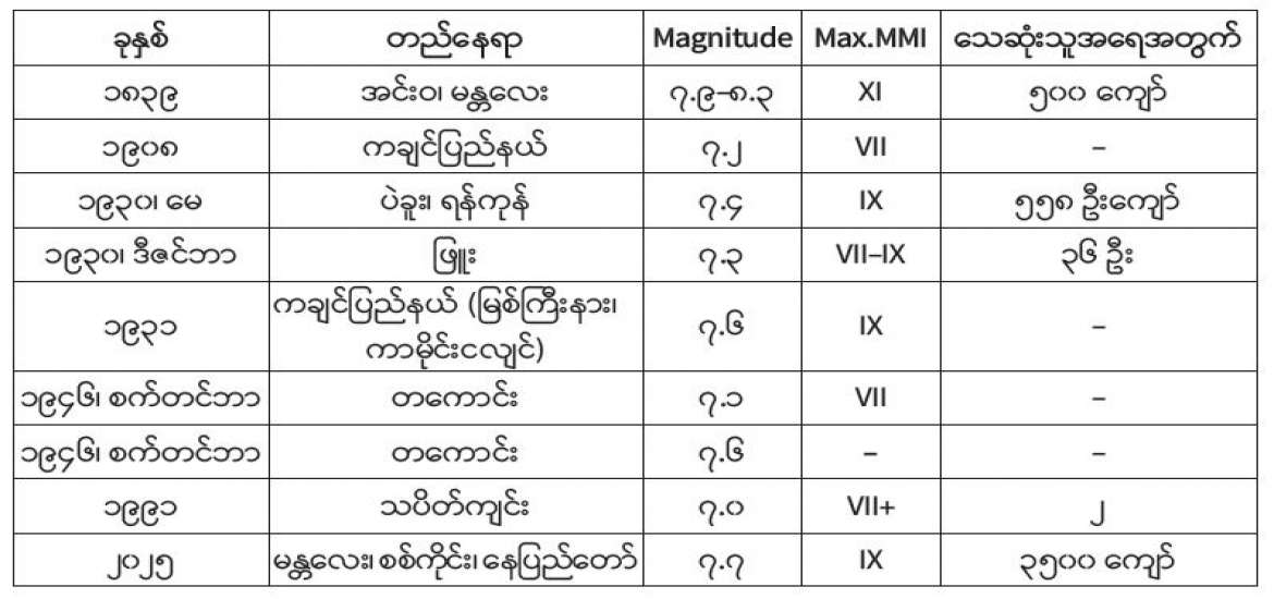 မြန်မာနိုင်ငံအတွင်း ငလျင်လှုပ်ခဲ့မှုဇယားကို လေ့လာကြည့်ရင် ၁၈၃၉ ခုနှစ်ကနေ ၁၉၀၈ ခုနှစ် အကြား ၆၉ နှစ်၊ ၁၉၀၈ ခုနှစ်မှ ၁၉၃၀ ပြည့်နှစ် အကြား ၂၂ နှစ်၊ ၁၉၃၀ ပြည့်နှစ်တွင် တစ်နှစ်အတွင်း (မေလနှင့် ဒီဇင်ဘာလ)၊ ၁၉၃၀ ပြည့်နှစ်မှ ၁၉၃၁ ခုနှစ်အကြား တစ်နှစ်၊ ၁၉၃၁ ခုနှစ်မှ ၁၉၄၆ ခုနှစ် အကြား ၁၅ နှစ်၊ ၁၉၄၆ ခုနှစ် တစ်နှစ်အတွင်း (စက်တင်ဘာလ၊ ၁၂ ရက်နေ့ အချက်အလက်တွေ အရ Magnitude ၇ ဒသမ ၁ လှုပ်ခတ်ခဲ့ပြီး ၃ မိနစ် ခန့်အကြာ Magnitude ၇ ဒသမ ၆ ငလျင်လှုပ်ခဲ့ပါတယ်။) ၁၉၄၆ ခုနှစ်မှ ၁၉၉၁ ခုနှစ်အကြား ၄၅ နှစ်နှင့် ၁၉၉၁ ခုနှစ်မှ ၂၀၂၅ ခုနှစ်အကြား ၃၄ နှစ် ကွာခြားပြီး လှုပ်ခဲ့တာကို လေ့လာတွေ့ရှိရပါတယ်။