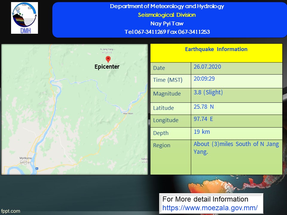 ၂၀၂၀ ပြည့်နှစ်၊ ဇူလိုင်လ(၂၆) ရက်နေ့၊ မြန်မာစံတော်ချိန် (၂၀) နာရီ၊ (၀၉) မိနစ်၊ (၂၉)စက္ကန့် အချိန် တွင် မြစ်ကြီးနားမြေငလျင်စခန်းမှ အရှေ့မြောက်ဘက် (၂၄)မိုင် ခန့်ကွာဝေးသော မြန်မာနိုင်ငံ ပြည်တွင်း (အင်ဂျန်းယန်မြို့၏ တောင်ဘက်(၃)မိုင်ခန့်အကွာ)၊ မြောက်လတ္တီတွဒ်(၂၅.၇၈) ဒီဂရီ၊ အရှေ့လောင်ဂျီတွဒ်(၉၇.၇၄)ဒီဂရီ၊ အနက်(၁၉)ကီလိုမီတာကို ဗဟိုပြု၍ အင်အားရစ်(ခ်)တာ စကေး (၃.၈)အဆင့်ရှိ အင်အားအနည်းငယ်ရှိသော မြေငလျင်တစ်ခု လှုပ်ရှားသွားကြောင်း တိုင်းထွာရရှိပါသည်။