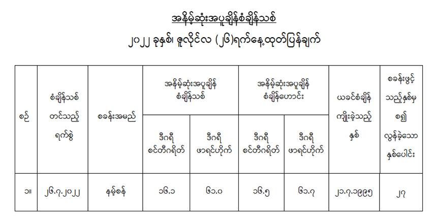 ၂၀၂၂ ခုနှစ်၊ ဇူလိုင်လ (၂၆)ရက်နေ့တွင် မိုးလေဝသနှင့် ဇလဗေဒညွှန်ကြားမှုဦးစီးဌာနမှ ထုတ်ပြန်သည့် ဇူလိုင်လ၏ အနိမ့်ဆုံးအပူချိန်စံချိန်သစ်-