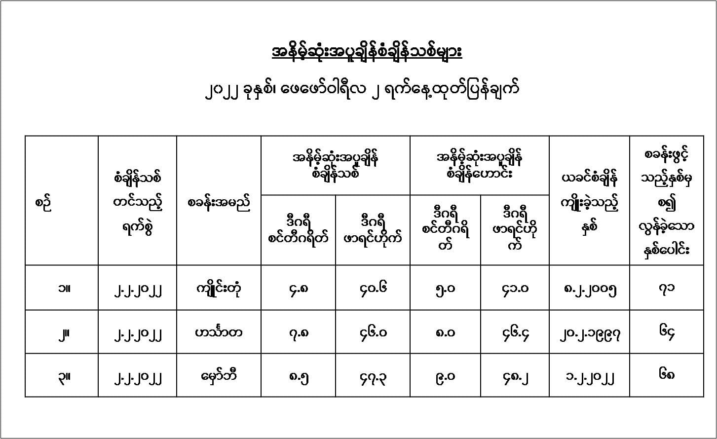 ၂၀၂၂ ခုနှစ်၊ ဖေဖော်ဝါရီလ (၂)ရက်နေ့တွင် မိုးလေဝသနှင့် ဇလဗေဒညွှန်ကြားမှုဦးစီးဌာနမှ ထုတ်ပြန်သည့် ဖေဖော်ဝါရီလ၏ အနိမ့်ဆုံးအပူချိန်စံချိန်သစ်များ-